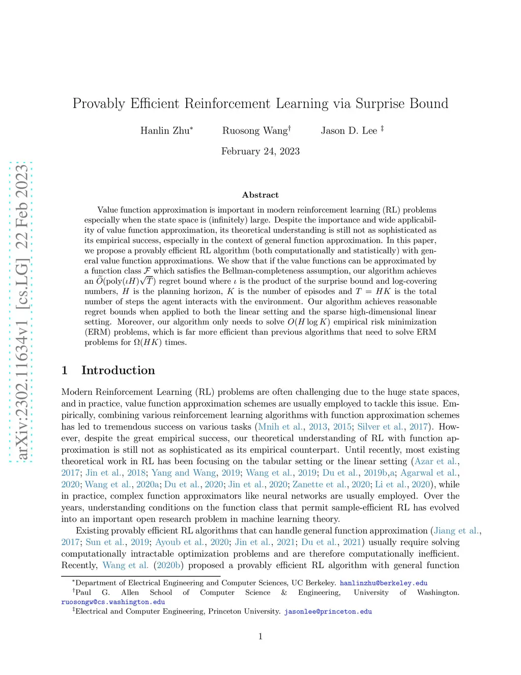 Provably Efficient Reinforcement Learning via Surprise Bound