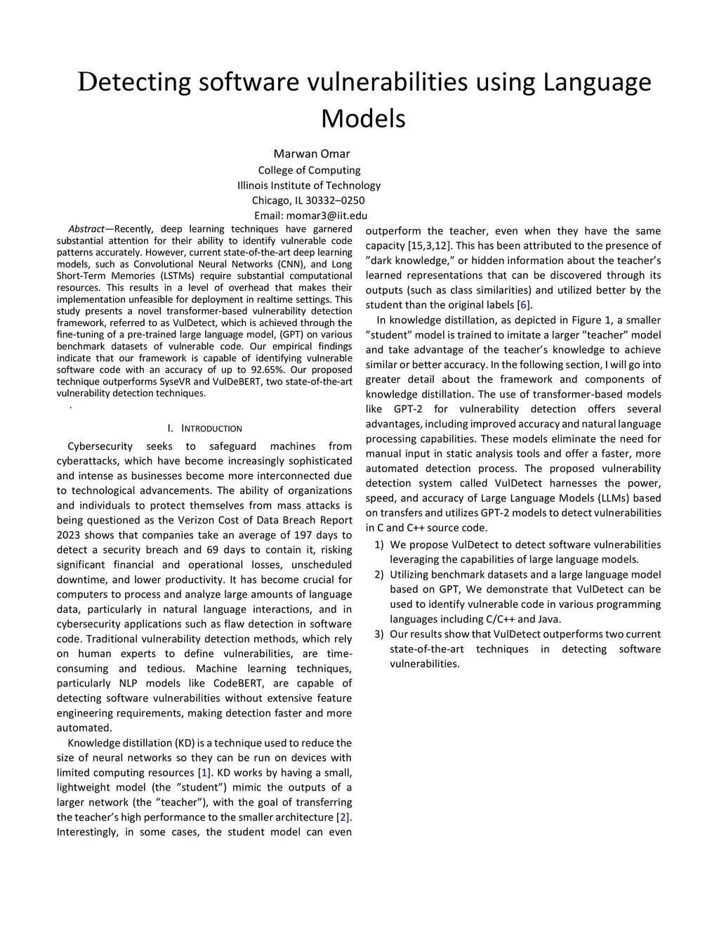 Recently, deep learning techniques have garnered substantial attention for their ability to identify vulnerable code patterns accurately. However, current state-of-the-art deep learning models, such as Convolutional Neural Networks (CNN), and Long Short-Term Memories (LSTMs) require substantial computational resources. This results in a level of overhead that makes their implementation unfeasible for deployment in realtime settings. This study presents a novel transformer-based vulnerability detection framework, referred to as VulDetect, which is achieved through the fine-tuning of a pre-trained large language model, (GPT) on various benchmark datasets of vulnerable code. Our empirical findings indicate that our framework is capable of identifying vulnerable software code with an accuracy of up to 92.65%. Our proposed technique outperforms SyseVR and VulDeBERT, two state-of-the-art vulnerability detection techniques