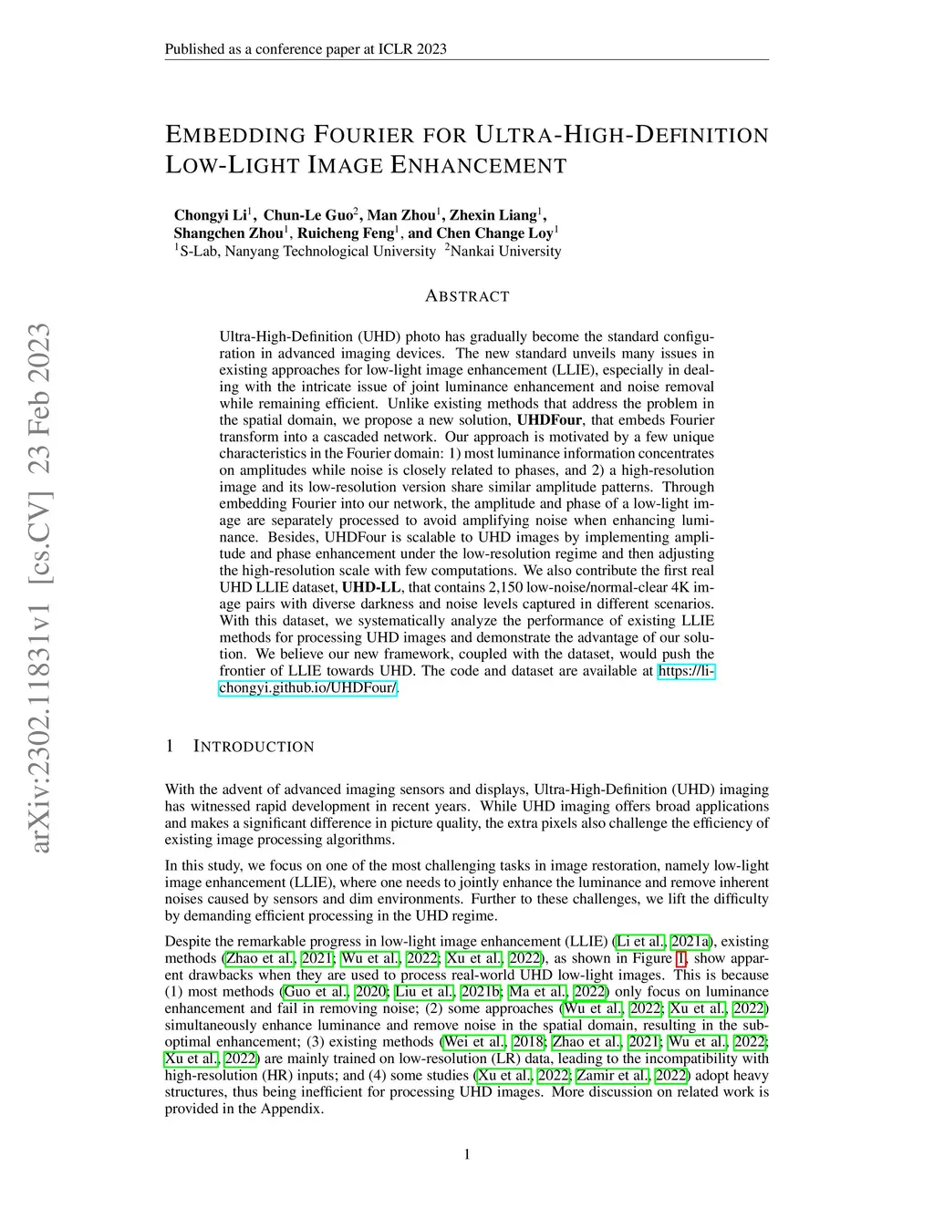 Ultra-High-Definition (UHD) photo has gradually become the standard configuration in advanced imaging devices. The new standard unveils many issues in existing approaches for low-light image enhancement (LLIE), especially in dealing with the intricate issue of joint luminance enhancement and noise removal while remaining efficient. Unlike existing methods that address the problem in the spatial domain, we propose a new solution, UHDFour, that embeds Fourier transform into a cascaded network. Our approach is motivated by a few unique characteristics in the Fourier domain: 1) most luminance information concentrates on amplitudes while noise is closely related to phases, and 2) a high-resolution image and its low-resolution version share similar amplitude patterns.Through embedding Fourier into our network, the amplitude and phase of a low-light image are separately processed to avoid amplifying noise when enhancing luminance. Besides, UHDFour is scalable to UHD images by implementing amplitude and phase enhancement under the low-resolution regime and then adjusting the high-resolution scale with few computations. We also contribute the first real UHD LLIE dataset, \textbf{UHD-LL}, that contains 2,150 low-noise/normal-clear 4K image pairs with diverse darkness and noise levels captured in different scenarios. With this dataset, we systematically analyze the performance of existing LLIE methods for processing UHD images and demonstrate the advantage of our solution. We believe our new framework, coupled with the dataset, would push the frontier of LLIE towards UHD. The code and dataset are available at https://li-chongyi.github.io/UHDFour.