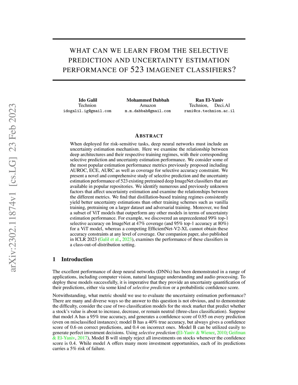 When deployed for risk-sensitive tasks, deep neural networks must include an uncertainty estimation mechanism. Here we examine the relationship between deep architectures and their respective training regimes, with their corresponding selective prediction and uncertainty estimation performance. We consider some of the most popular estimation performance metrics previously proposed including AUROC, ECE, AURC as well as coverage for selective accuracy constraint. We present a novel and comprehensive study of selective prediction and the uncertainty estimation performance of 523 existing pretrained deep ImageNet classifiers that are available in popular repositories. We identify numerous and previously unknown factors that affect uncertainty estimation and examine the relationships between the different metrics. We find that distillation-based training regimes consistently yield better uncertainty estimations than other training schemes such as vanilla training, pretraining on a larger dataset and adversarial training. Moreover, we find a subset of ViT models that outperform any other models in terms of uncertainty estimation performance. For example, we discovered an unprecedented 99% top-1 selective accuracy on ImageNet at 47% coverage (and 95% top-1 accuracy at 80%) for a ViT model, whereas a competing EfficientNet-V2-XL cannot obtain these accuracy constraints at any level of coverage. Our companion paper, also published in ICLR 2023 (A framework for benchmarking class-out-of-distribution detection and its application to ImageNet), examines the performance of these classifiers in a class-out-of-distribution setting.