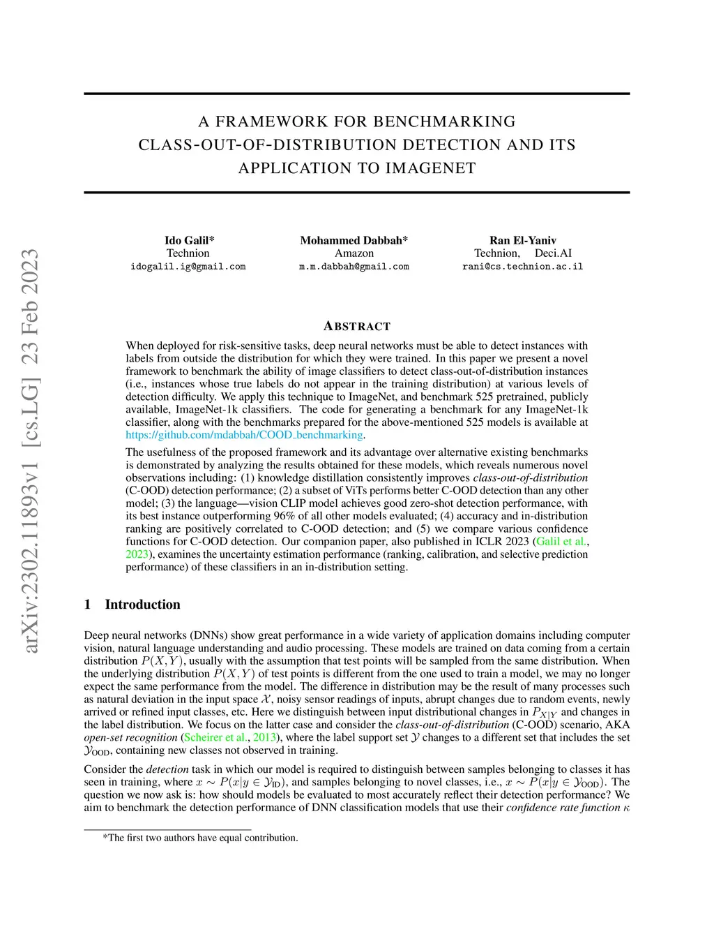 When deployed for risk-sensitive tasks, deep neural networks must be able to detect instances with labels from outside the distribution for which they were trained. In this paper we present a novel framework to benchmark the ability of image classifiers to detect class-out-of-distribution instances (i.e., instances whose true labels do not appear in the training distribution) at various levels of detection difficulty. We apply this technique to ImageNet, and benchmark 525 pretrained, publicly available, ImageNet-1k classifiers. The code for generating a benchmark for any ImageNet-1k classifier, along with the benchmarks prepared for the above-mentioned 525 models is available at https://github.com/mdabbah/COOD_benchmarking. The usefulness of the proposed framework and its advantage over alternative existing benchmarks is demonstrated by analyzing the results obtained for these models, which reveals numerous novel observations including: (1) knowledge distillation consistently improves class-out-of-distribution (C-OOD) detection performance; (2) a subset of ViTs performs better C-OOD detection than any other model; (3) the language--vision CLIP model achieves good zero-shot detection performance, with its best instance outperforming 96% of all other models evaluated; (4) accuracy and in-distribution ranking are positively correlated to C-OOD detection; and (5) we compare various confidence functions for C-OOD detection. Our companion paper, also published in ICLR 2023 (What Can We Learn From The Selective Prediction And Uncertainty Estimation Performance Of 523 Imagenet Classifiers), examines the uncertainty estimation performance (ranking, calibration, and selective prediction performance) of these classifiers in an in-distribution setting.
