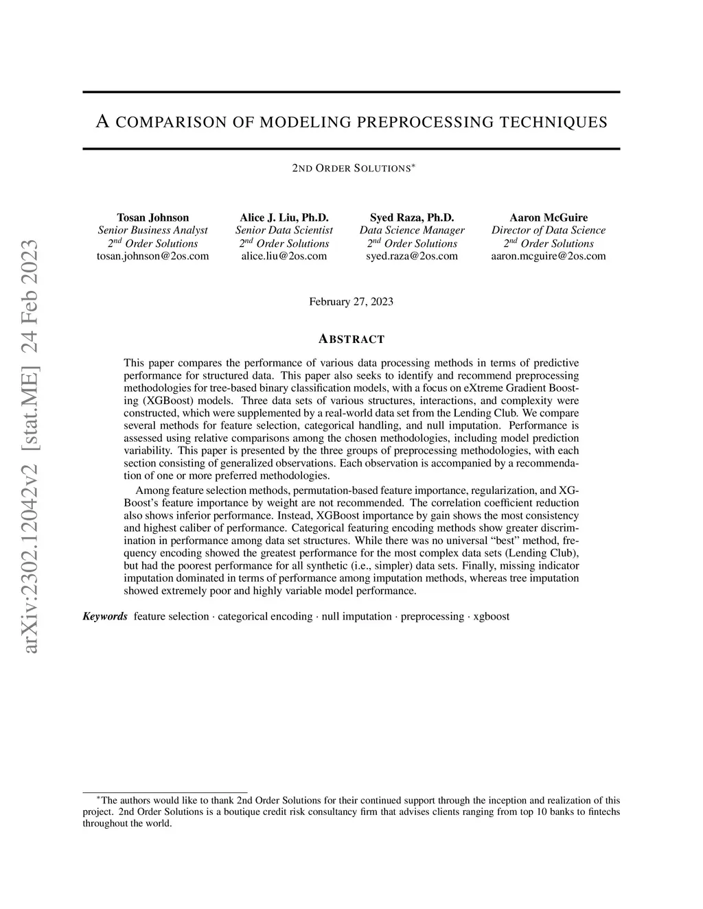 This paper compares the performance of various data processing methods in terms of predictive performance for structured data. This paper also seeks to identify and recommend preprocessing methodologies for tree-based binary classification models, with a focus on eXtreme Gradient Boosting (XGBoost) models. Three data sets of various structures, interactions, and complexity were constructed, which were supplemented by a real-world data set from the Lending Club. We compare several methods for feature selection, categorical handling, and null imputation. Performance is assessed using relative comparisons among the chosen methodologies, including model prediction variability. This paper is presented by the three groups of preprocessing methodologies, with each section consisting of generalized observations. Each observation is accompanied by a recommendation of one or more preferred methodologies. Among feature selection methods, permutation-based feature importance, regularization, and XGBoost's feature importance by weight are not recommended. The correlation coefficient reduction also shows inferior performance. Instead, XGBoost importance by gain shows the most consistency and highest caliber of performance. Categorical featuring encoding methods show greater discrimination in performance among data set structures. While there was no universal "best" method, frequency encoding showed the greatest performance for the most complex data sets (Lending Club), but had the poorest performance for all synthetic (i.e., simpler) data sets. Finally, missing indicator imputation dominated in terms of performance among imputation methods, whereas tree imputation showed extremely poor and highly variable model performance.