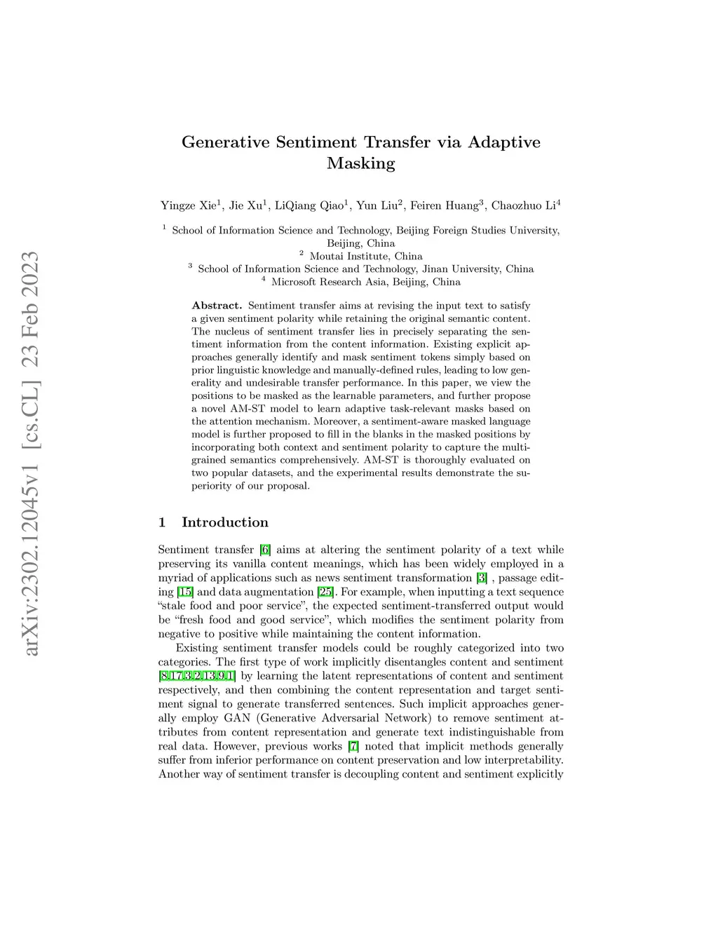 Generative Sentiment Transfer via Adaptive Masking