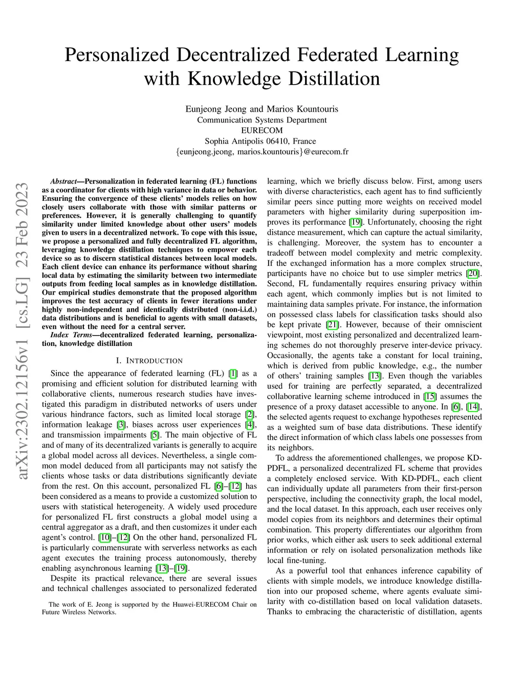 Personalization in federated learning (FL) functions as a coordinator for clients with high variance in data or behavior. Ensuring the convergence of these clients' models relies on how closely users collaborate with those with similar patterns or preferences. However, it is generally challenging to quantify similarity under limited knowledge about other users' models given to users in a decentralized network. To cope with this issue, we propose a personalized and fully decentralized FL algorithm, leveraging knowledge distillation techniques to empower each device so as to discern statistical distances between local models. Each client device can enhance its performance without sharing local data by estimating the similarity between two intermediate outputs from feeding local samples as in knowledge distillation. Our empirical studies demonstrate that the proposed algorithm improves the test accuracy of clients in fewer iterations under highly non-independent and identically distributed (non-i.i.d.) data distributions and is beneficial to agents with small datasets, even without the need for a central server.