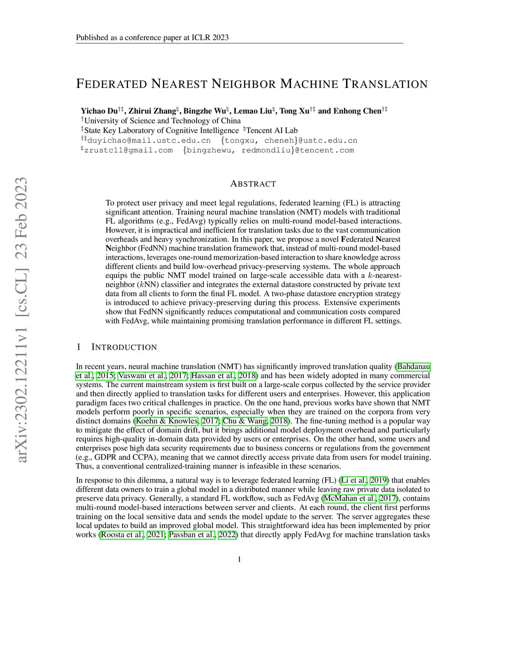 To protect user privacy and meet legal regulations, federated learning (FL) is attracting significant attention. Training neural machine translation (NMT) models with traditional FL algorithm (e.g., FedAvg) typically relies on multi-round model-based interactions. However, it is impractical and inefficient for machine translation tasks due to the vast communication overheads and heavy synchronization. In this paper, we propose a novel federated nearest neighbor (FedNN) machine translation framework that, instead of multi-round model-based interactions, leverages one-round memorization-based interaction to share knowledge across different clients to build low-overhead privacy-preserving systems. The whole approach equips the public NMT model trained on large-scale accessible data with a -nearest-neighbor ($$kNN) classifier and integrates the external datastore constructed by private text data in all clients to form the final FL model. A two-phase datastore encryption strategy is introduced to achieve privacy-preserving during this process. Extensive experiments show that FedNN significantly reduces computational and communication costs compared with FedAvg, while maintaining promising performance in different FL settings.