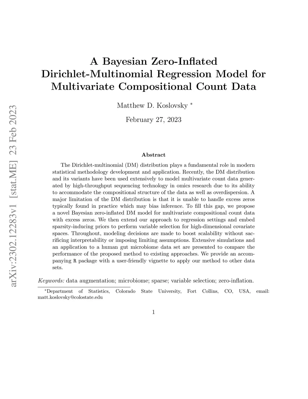 The Dirichlet-multinomial (DM) distribution plays a fundamental role in modern statistical methodology development and application. Recently, the DM distribution and its variants have been used extensively to model multivariate count data generated by high-throughput sequencing technology in omics research due to its ability to accommodate the compositional structure of the data as well as overdispersion. A major limitation of the DM distribution is that it is unable to handle excess zeros typically found in practice which may bias inference. To fill this gap, we propose a novel Bayesian zero-inflated DM model for multivariate compositional count data with excess zeros. We then extend our approach to regression settings and embed sparsity-inducing priors to perform variable selection for high-dimensional covariate spaces. Throughout, modeling decisions are made to boost scalability without sacrificing interpretability or imposing limiting assumptions. Extensive simulations and an application to a human gut microbiome data set are presented to compare the performance of the proposed method to existing approaches. We provide an accompanying R package with a user-friendly vignette to apply our method to other data sets.