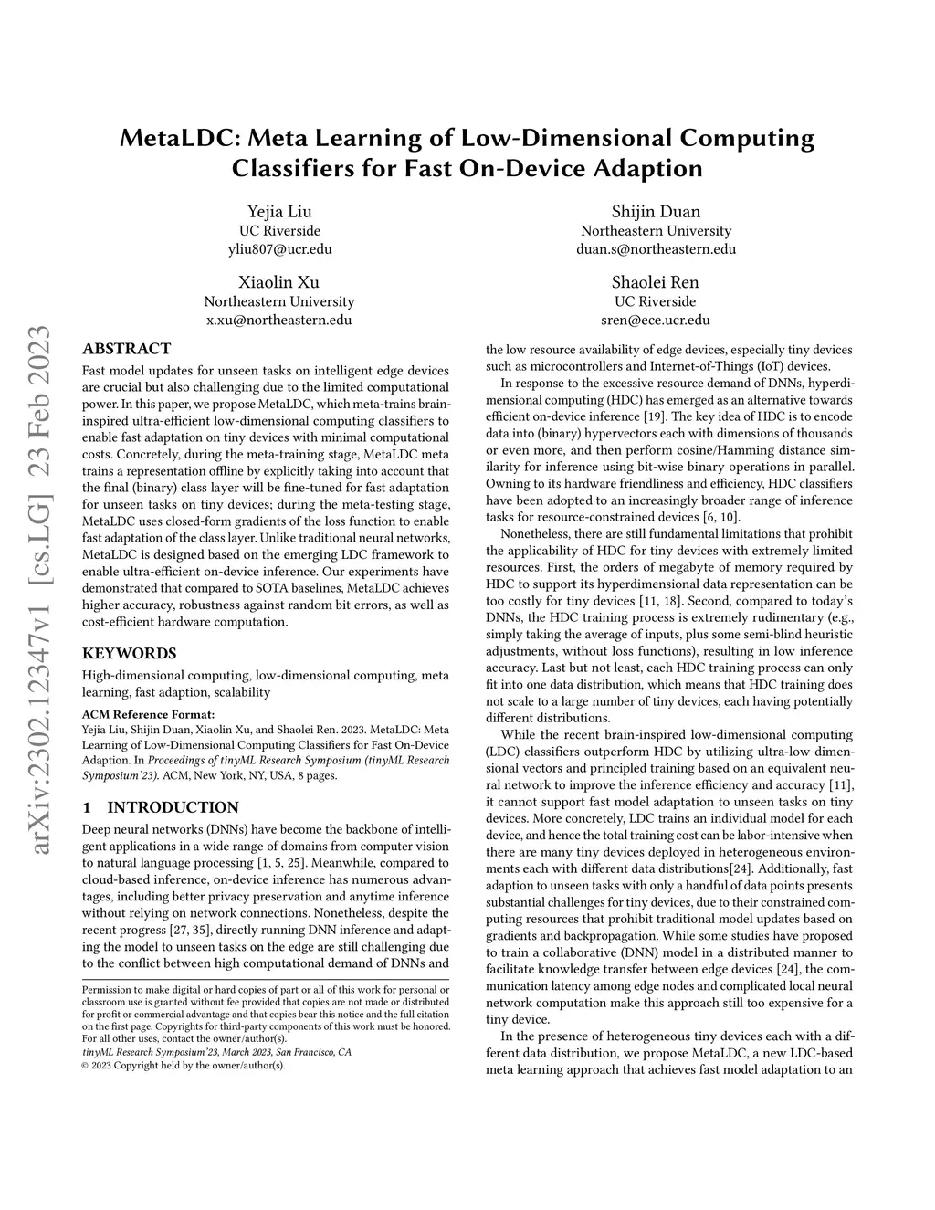 Fast model updates for unseen tasks on intelligent edge devices are crucial but also challenging due to the limited computational power. In this paper,we propose MetaLDC, which meta-trains braininspired ultra-efficient low-dimensional computing classifiers to enable fast adaptation on tiny devices with minimal computational costs. Concretely, during the meta-training stage, MetaLDC meta trains a representation offline by explicitly taking into account that the final (binary) class layer will be fine-tuned for fast adaptation for unseen tasks on tiny devices; during the meta-testing stage, MetaLDC uses closed-form gradients of the loss function to enable fast adaptation of the class layer. Unlike traditional neural networks, MetaLDC is designed based on the emerging LDC framework to enable ultra-efficient on-device inference. Our experiments have demonstrated that compared to SOTA baselines, MetaLDC achieves higher accuracy, robustness against random bit errors, as well as cost-efficient hardware computation.