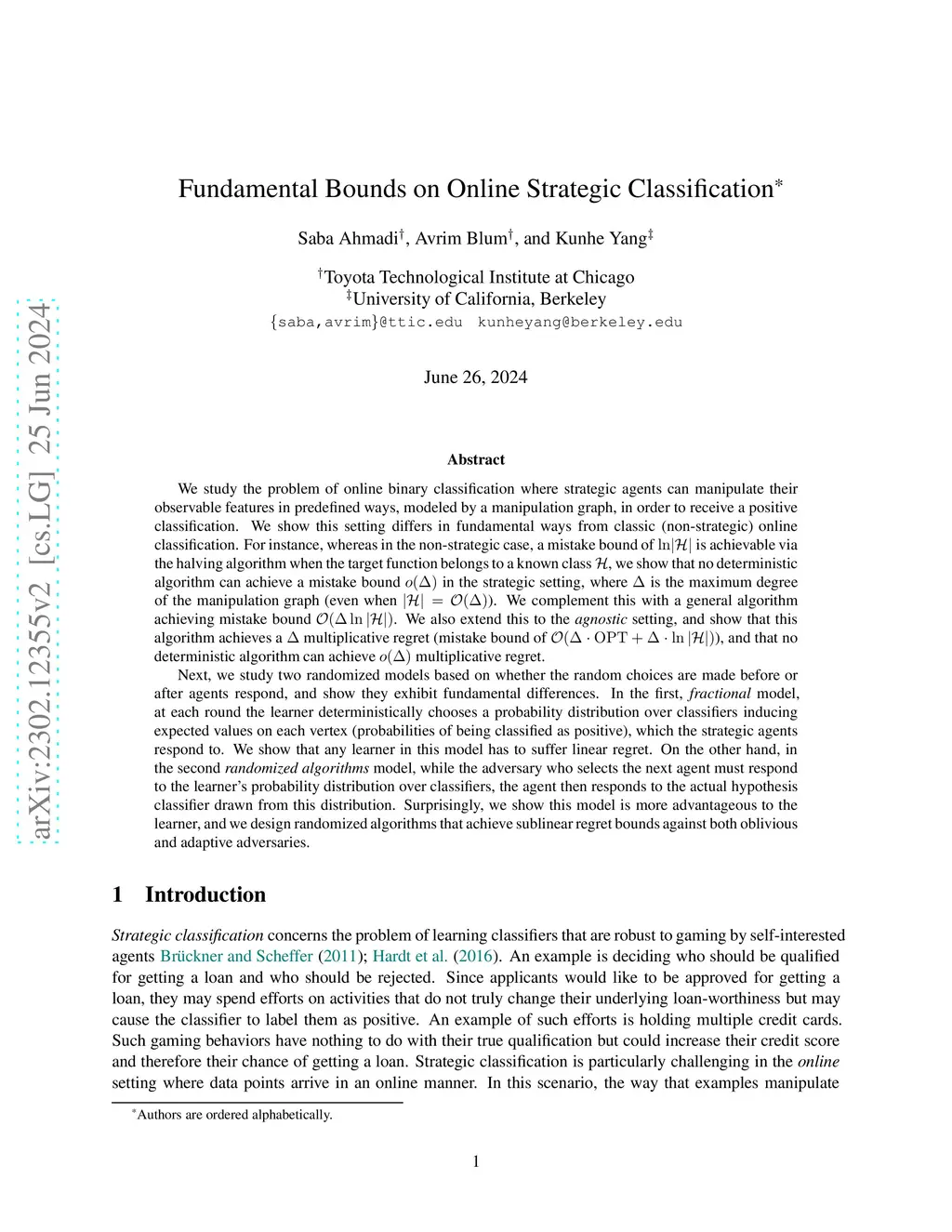 We study the problem of online binary classification where strategic agents can manipulate their observable features in predefined ways, modeled by a manipulation graph, in order to receive a positive classification. We show this setting differs in fundamental ways from non-strategic online classification. For instance, whereas in the non-strategic case, a mistake bound of is achievable via the halving algorithm when the target function belongs to a known class , we show that no deterministic algorithm can achieve a mistake bound in the strategic setting, where is the maximum degree of the manipulation graph (even when ). We obtain an algorithm achieving mistake bound . We also extend this to the agnostic setting and obtain an algorithm with a multiplicative regret, and we show no deterministic algorithm can achieve multiplicative regret. Next, we study two randomized models based on whether the random choices are made before or after agents respond, and show they exhibit fundamental differences. In the first model, at each round the learner deterministically chooses a probability distribution over classifiers inducing expected values on each vertex (probabilities of being classified as positive), which the strategic agents respond to. We show that any learner in this model has to suffer linear regret. On the other hand, in the second model, while the adversary who selects the next agent must respond to the learner's probability distribution over classifiers, the agent then responds to the actual hypothesis classifier drawn from this distribution. Surprisingly, we show this model is more advantageous to the learner, and we design randomized algorithms that achieve sublinear regret bounds against both oblivious and adaptive adversaries.