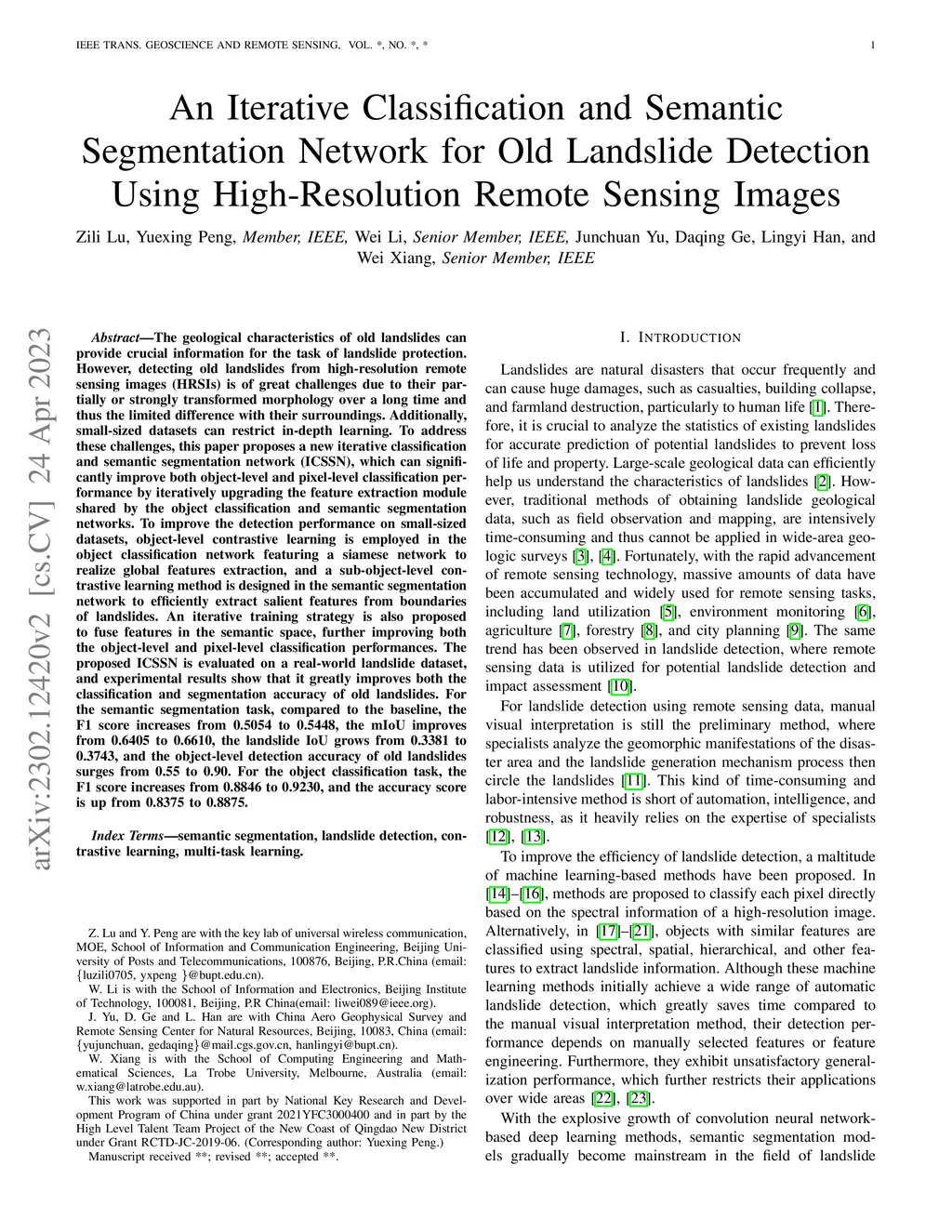Huge challenges exist for old landslide detection because their morphology features have been partially or strongly transformed over a long time and have little difference from their surrounding. Besides, small-sample problem also restrict in-depth learning. In this paper, an iterative classification and semantic segmentation network (ICSSN) is developed, which can greatly enhance both object-level and pixel-level classification performance by iteratively upgrading the feature extractor shared by two network. An object-level contrastive learning (OCL) strategy is employed in the object classification sub-network featuring a siamese network to realize the global features extraction, and a sub-object-level contrastive learning (SOCL) paradigm is designed in the semantic segmentation sub-network to efficiently extract salient features from boundaries of landslides. Moreover, an iterative training strategy is elaborated to fuse features in semantic space such that both object-level and pixel-level classification performance are improved. The proposed ICSSN is evaluated on the real landslide data set, and the experimental results show that ICSSN can greatly improve the classification and segmentation accuracy of old landslide detection. For the semantic segmentation task, compared to the baseline, the F1 score increases from 0.5054 to 0.5448, the mIoU improves from 0.6405 to 0.6610, the landslide IoU improved from 0.3381 to 0.3743, and the object-level detection accuracy of old landslides is enhanced from 0.55 to 0.9. For the object classification task, the F1 score increases from 0.8846 to 0.9230, and the accuracy score is up from 0.8375 to 0.8875.