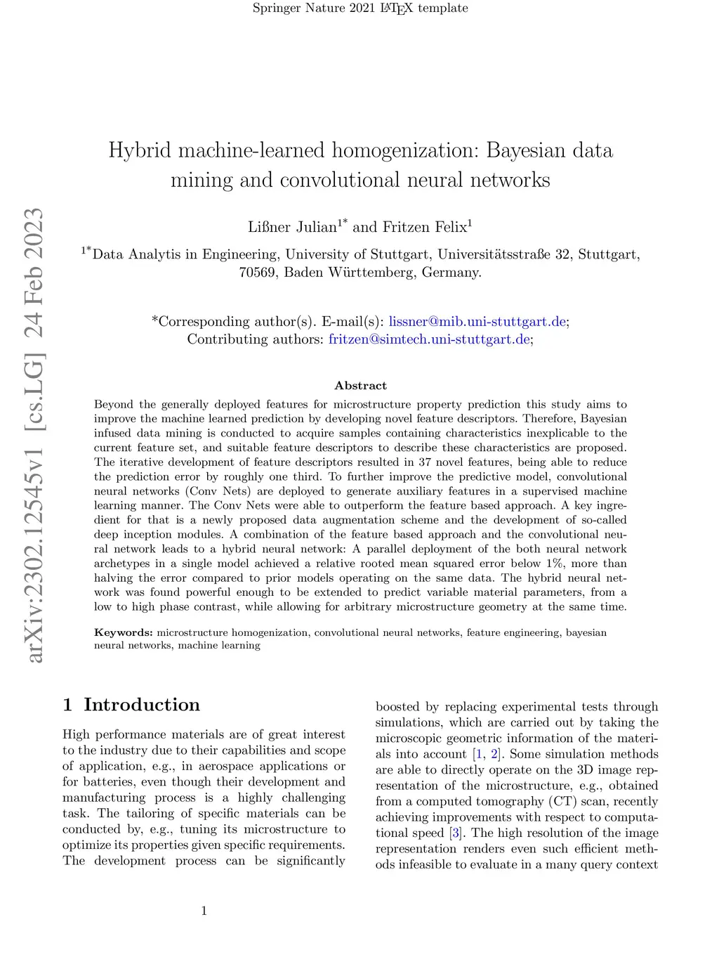 Beyond the generally deployed features for microstructure property prediction this study aims to improve the machine learned prediction by developing novel feature descriptors. Therefore, Bayesian infused data mining is conducted to acquire samples containing characteristics inexplicable to the current feature set, and suitable feature descriptors to describe these characteristics are proposed. The iterative development of feature descriptors resulted in 37 novel features, being able to reduce the prediction error by roughly one third. To further improve the predictive model, convolutional neural networks (Conv Nets) are deployed to generate auxiliary features in a supervised machine learning manner. The Conv Nets were able to outperform the feature based approach. A key ingredient for that is a newly proposed data augmentation scheme and the development of so-called deep inception modules. A combination of the feature based approach and the convolutional neural network leads to a hybrid neural network: A parallel deployment of the both neural network archetypes in a single model achieved a relative rooted mean squared error below 1%, more than halving the error compared to prior models operating on the same data. The hybrid neural network was found powerful enough to be extended to predict variable material parameters, from a low to high phase contrast, while allowing for arbitrary microstructure geometry at the same time.