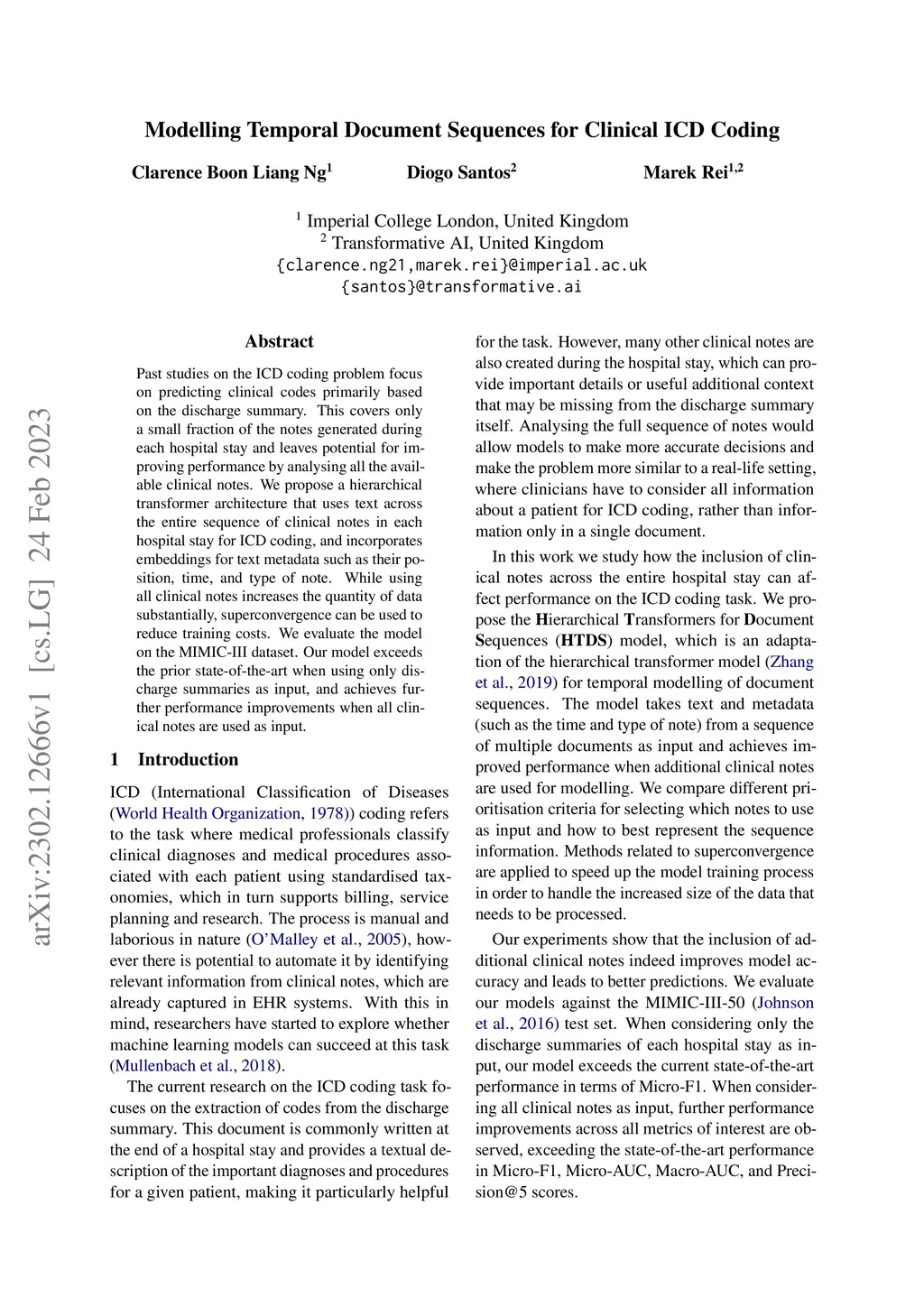 Past studies on the ICD coding problem focus on predicting clinical codes primarily based on the discharge summary. This covers only a small fraction of the notes generated during each hospital stay and leaves potential for improving performance by analysing all the available clinical notes. We propose a hierarchical transformer architecture that uses text across the entire sequence of clinical notes in each hospital stay for ICD coding, and incorporates embeddings for text metadata such as their position, time, and type of note. While using all clinical notes increases the quantity of data substantially, superconvergence can be used to reduce training costs. We evaluate the model on the MIMIC-III dataset. Our model exceeds the prior state-of-the-art when using only discharge summaries as input, and achieves further performance improvements when all clinical notes are used as input.