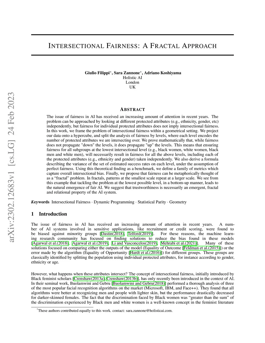 The issue of fairness in AI has received an increasing amount of attention in recent years. The problem can be approached by looking at different protected attributes (e.g., ethnicity, gender, etc) independently, but fairness for individual protected attributes does not imply intersectional fairness. In this work, we frame the problem of intersectional fairness within a geometrical setting. We project our data onto a hypercube, and split the analysis of fairness by levels, where each level encodes the number of protected attributes we are intersecting over. We prove mathematically that, while fairness does not propagate "down" the levels, it does propagate "up" the levels. This means that ensuring fairness for all subgroups at the lowest intersectional level (e.g., black women, white women, black men and white men), will necessarily result in fairness for all the above levels, including each of the protected attributes (e.g., ethnicity and gender) taken independently. We also derive a formula describing the variance of the set of estimated success rates on each level, under the assumption of perfect fairness. Using this theoretical finding as a benchmark, we define a family of metrics which capture overall intersectional bias. Finally, we propose that fairness can be metaphorically thought of as a "fractal" problem. In fractals, patterns at the smallest scale repeat at a larger scale. We see from this example that tackling the problem at the lowest possible level, in a bottom-up manner, leads to the natural emergence of fair AI. We suggest that trustworthiness is necessarily an emergent, fractal and relational property of the AI system.
