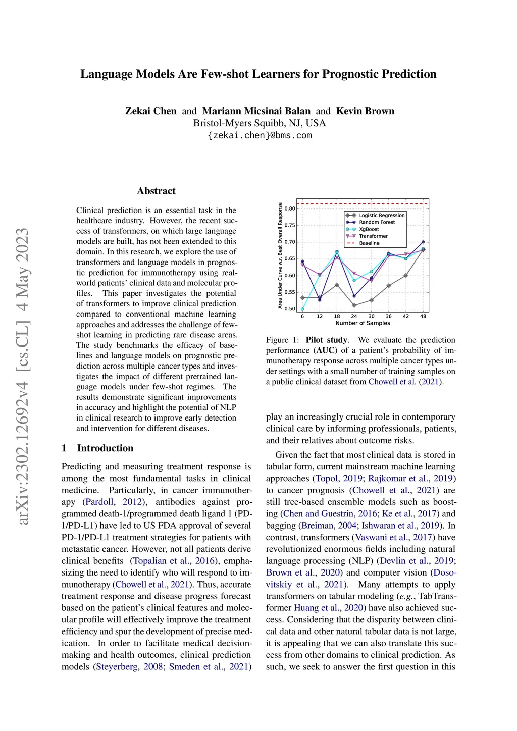 Clinical prediction is an essential task in the healthcare industry. However, the recent success of transformers, on which large language models are built, has not been extended to this domain. In this research, we explore the use of transformers and language models in prognostic prediction for immunotherapy using real-world patients' clinical data and molecular profiles. This paper investigates the potential of transformers to improve clinical prediction compared to conventional machine learning approaches and addresses the challenge of few-shot learning in predicting rare disease areas. The study benchmarks the efficacy of baselines and language models on prognostic prediction across multiple cancer types and investigates the impact of different pretrained language models under few-shot regimes. The results demonstrate significant improvements in accuracy and highlight the potential of NLP in clinical research to improve early detection and intervention for different diseases.
