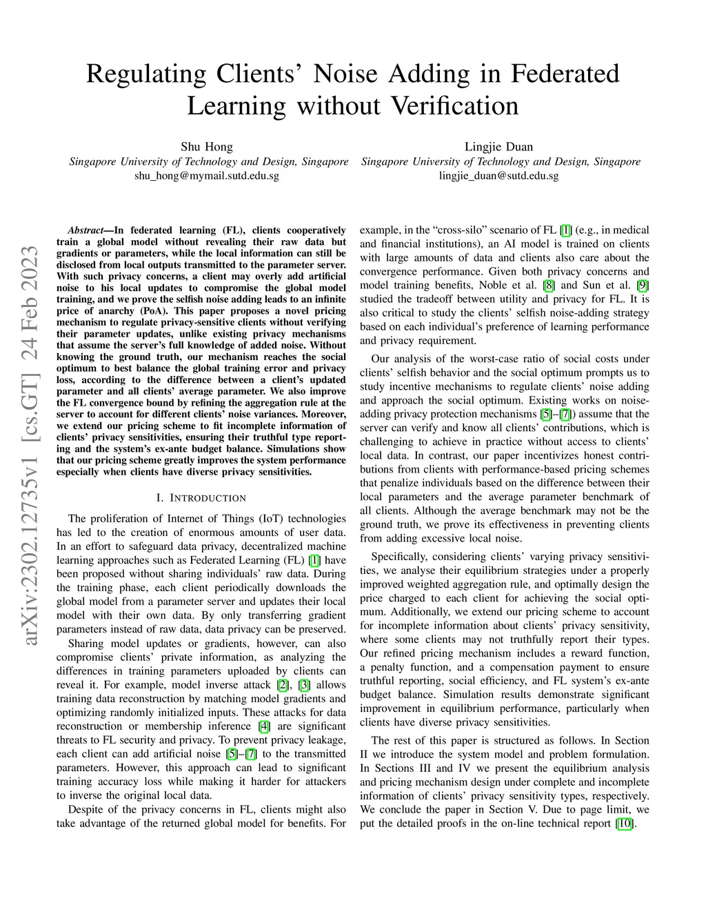 In federated learning (FL), clients cooperatively train a global model without revealing their raw data but gradients or parameters, while the local information can still be disclosed from local outputs transmitted to the parameter server. With such privacy concerns, a client may overly add artificial noise to his local updates to compromise the global model training, and we prove the selfish noise adding leads to an infinite price of anarchy (PoA). This paper proposes a novel pricing mechanism to regulate privacy-sensitive clients without verifying their parameter updates, unlike existing privacy mechanisms that assume the server's full knowledge of added noise. Without knowing the ground truth, our mechanism reaches the social optimum to best balance the global training error and privacy loss, according to the difference between a client's updated parameter and all clients' average parameter. We also improve the FL convergence bound by refining the aggregation rule at the server to account for different clients' noise variances. Moreover, we extend our pricing scheme to fit incomplete information of clients' privacy sensitivities, ensuring their truthful type reporting and the system's ex-ante budget balance. Simulations show that our pricing scheme greatly improves the system performance especially when clients have diverse privacy sensitivities.