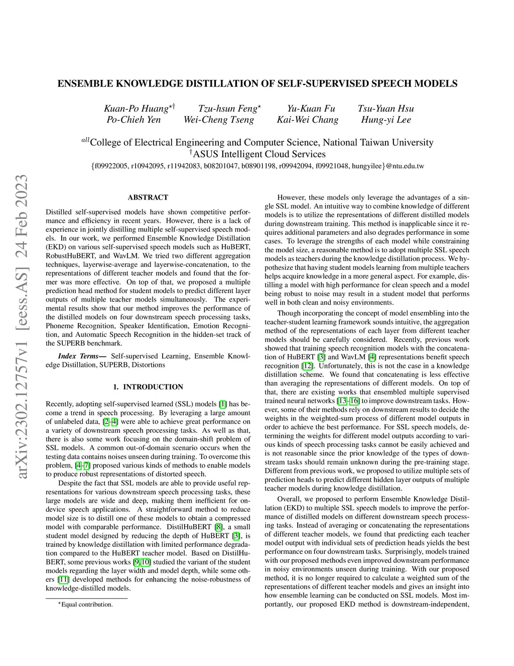 Distilled self-supervised models have shown competitive performance and efficiency in recent years. However, there is a lack of experience in jointly distilling multiple self-supervised speech models. In our work, we performed Ensemble Knowledge Distillation (EKD) on various self-supervised speech models such as HuBERT, RobustHuBERT, and WavLM. We tried two different aggregation techniques, layerwise-average and layerwise-concatenation, to the representations of different teacher models and found that the former was more effective. On top of that, we proposed a multiple prediction head method for student models to predict different layer outputs of multiple teacher models simultaneously. The experimental results show that our method improves the performance of the distilled models on four downstream speech processing tasks, Phoneme Recognition, Speaker Identification, Emotion Recognition, and Automatic Speech Recognition in the hidden-set track of the SUPERB benchmark.
