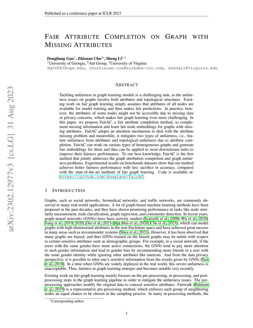 Tackling unfairness in graph learning models is a challenging task, as the unfairness issues on graphs involve both attributes and topological structures. Existing work on fair graph learning simply assumes that attributes of all nodes are available for model training and then makes fair predictions. In practice, however, the attributes of some nodes might not be accessible due to missing data or privacy concerns, which makes fair graph learning even more challenging. In this paper, we propose FairAC, a fair attribute completion method, to complement missing information and learn fair node embeddings for graphs with missing attributes. FairAC adopts an attention mechanism to deal with the attribute missing problem and meanwhile, it mitigates two types of unfairness, i.e., feature unfairness from attributes and topological unfairness due to attribute completion. FairAC can work on various types of homogeneous graphs and generate fair embeddings for them and thus can be applied to most downstream tasks to improve their fairness performance. To our best knowledge, FairAC is the first method that jointly addresses the graph attribution completion and graph unfairness problems. Experimental results on benchmark datasets show that our method achieves better fairness performance with less sacrifice in accuracy, compared with the state-of-the-art methods of fair graph learning. Code is available at: https://github.com/donglgcn/FairAC.