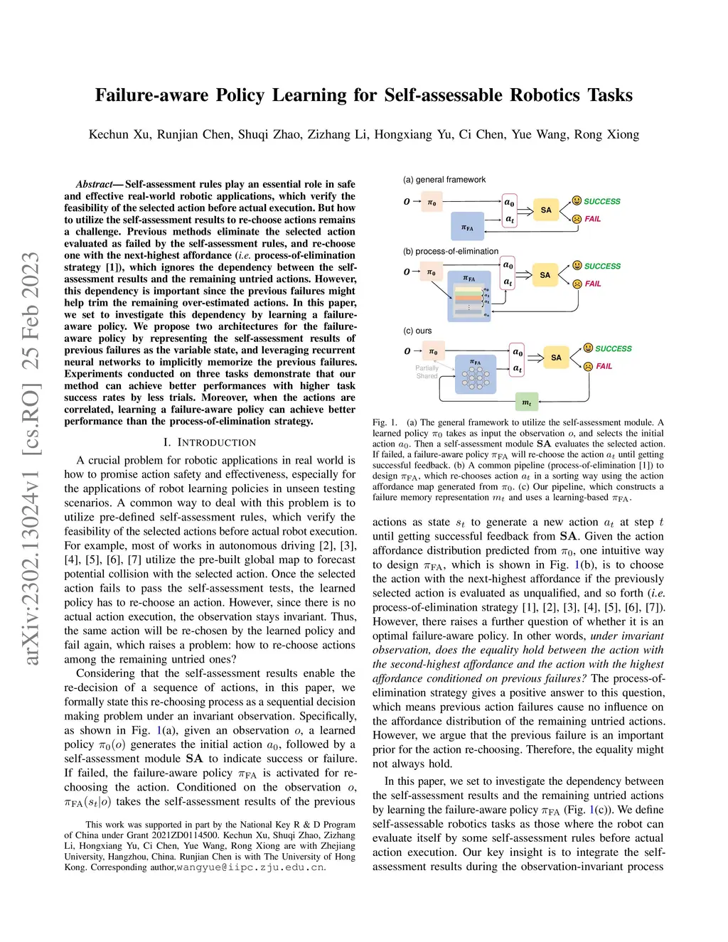 Self-assessment rules play an essential role in safe and effective real-world robotic applications, which verify the feasibility of the selected action before actual execution. But how to utilize the self-assessment results to re-choose actions remains a challenge. Previous methods eliminate the selected action evaluated as failed by the self-assessment rules, and re-choose one with the next-highest affordance~(i.e. process-of-elimination strategy [1]), which ignores the dependency between the self-assessment results and the remaining untried actions. However, this dependency is important since the previous failures might help trim the remaining over-estimated actions. In this paper, we set to investigate this dependency by learning a failure-aware policy. We propose two architectures for the failure-aware policy by representing the self-assessment results of previous failures as the variable state, and leveraging recurrent neural networks to implicitly memorize the previous failures. Experiments conducted on three tasks demonstrate that our method can achieve better performances with higher task success rates by less trials. Moreover, when the actions are correlated, learning a failure-aware policy can achieve better performance than the process-of-elimination strategy.