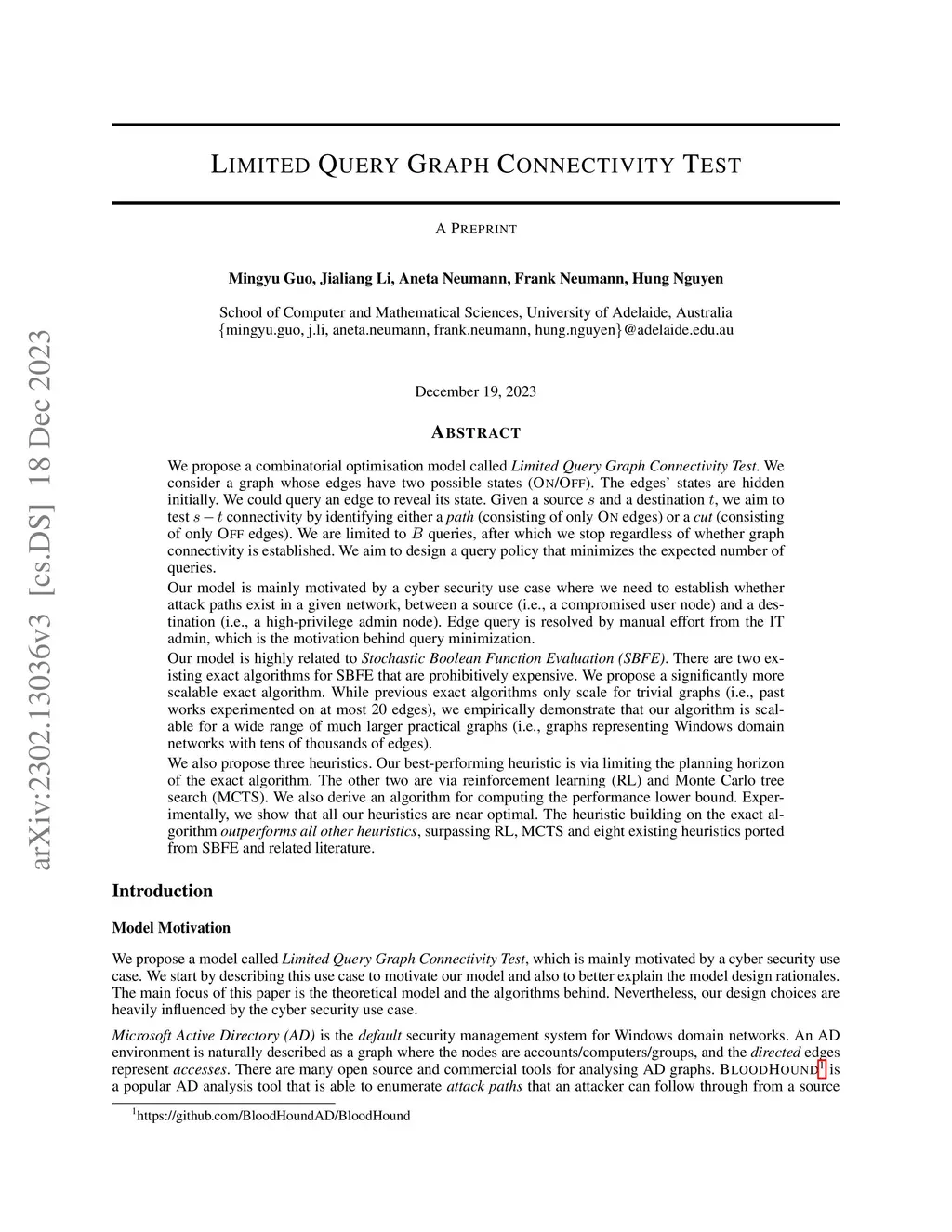 We propose a combinatorial optimisation model called Limited Query Graph Connectivity Test. We consider a graph whose edges have two possible states (On/Off). The edges' states are hidden initially. We could query an edge to reveal its state. Given a source s and a destination t, we aim to test s-t connectivity by identifying either a path (consisting of only On edges) or a cut (consisting of only Off edges). We are limited to B queries, after which we stop regardless of whether graph connectivity is established. We aim to design a query policy that minimizes the expected number of queries. Our model is mainly motivated by a cyber security use case where we need to establish whether an attack path exists in a network, between a source and a destination. Edge query is resolved by manual effort from the IT admin, which is the motivation behind query minimization. Our model is highly related to monotone Stochastic Boolean Function Evaluation (SBFE). There are two existing exact algorithms for SBFE that are prohibitively expensive. We propose a significantly more scalable exact algorithm. While previous exact algorithms only scale for trivial graphs (i.e., past works experimented on at most 20 edges), we empirically demonstrate that our algorithm is scalable for a wide range of much larger practical graphs (i.e., Windows domain network graphs with tens of thousands of edges). We propose three heuristics. Our best-performing heuristic is via reducing the search horizon of the exact algorithm. The other two are via reinforcement learning (RL) and Monte Carlo tree search (MCTS). We also derive an anytime algorithm for computing the performance lower bound. Experimentally, we show that all our heuristics are near optimal. The exact algorithm based heuristic outperforms all, surpassing RL, MCTS and 8 existing heuristics ported from SBFE and related literature.