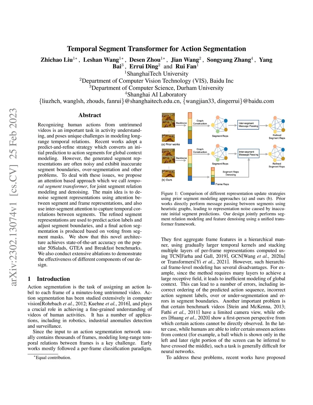 Recognizing human actions from untrimmed videos is an important task in activity understanding, and poses unique challenges in modeling long-range temporal relations. Recent works adopt a predict-and-refine strategy which converts an initial prediction to action segments for global context modeling. However, the generated segment representations are often noisy and exhibit inaccurate segment boundaries, over-segmentation and other problems. To deal with these issues, we propose an attention based approach which we call \textit{temporal segment transformer}, for joint segment relation modeling and denoising. The main idea is to denoise segment representations using attention between segment and frame representations, and also use inter-segment attention to capture temporal correlations between segments. The refined segment representations are used to predict action labels and adjust segment boundaries, and a final action segmentation is produced based on voting from segment masks. We show that this novel architecture achieves state-of-the-art accuracy on the popular 50Salads, GTEA and Breakfast benchmarks. We also conduct extensive ablations to demonstrate the effectiveness of different components of our design.
