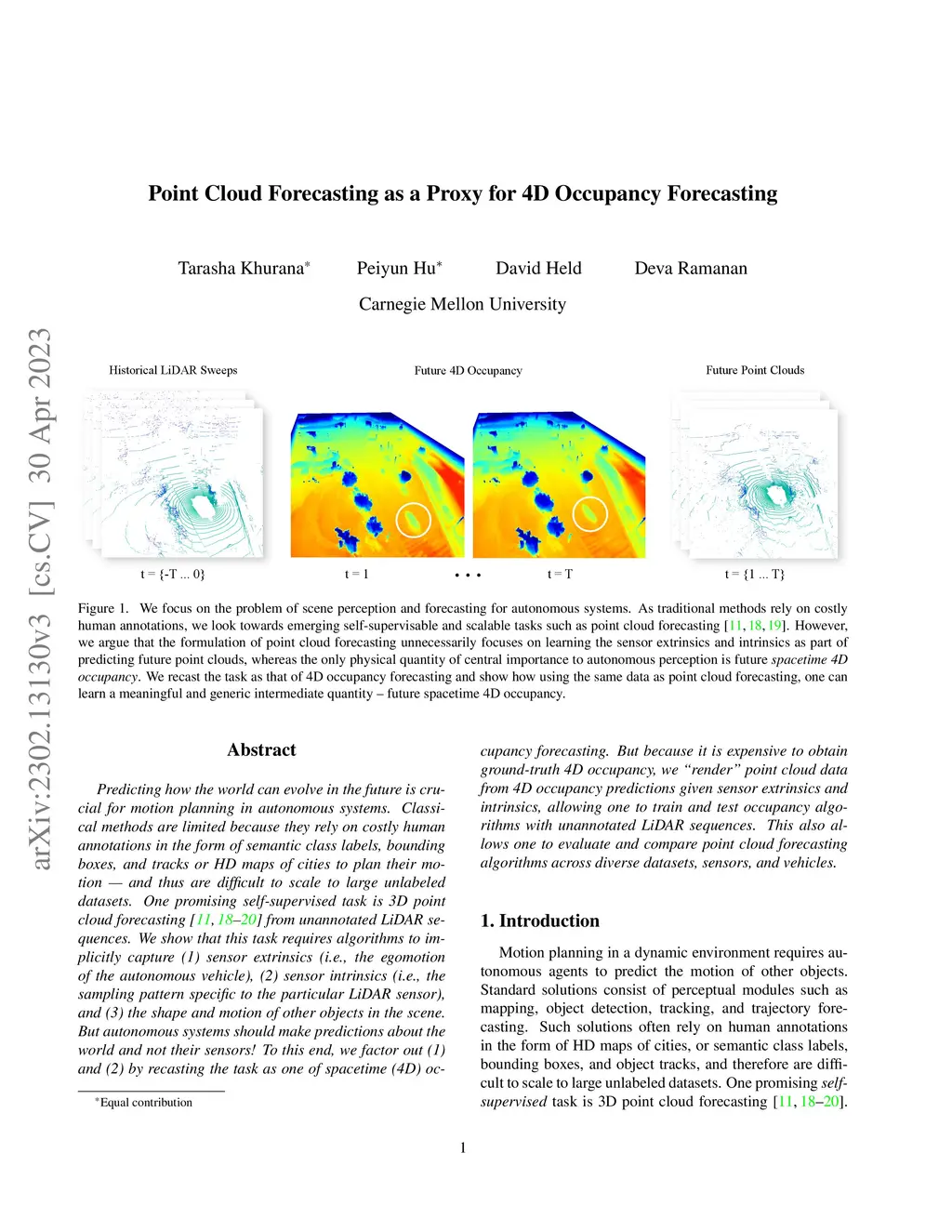 Predicting how the world can evolve in the future is crucial for motion planning in autonomous systems. Classical methods are limited because they rely on costly human annotations in the form of semantic class labels, bounding boxes, and tracks or HD maps of cities to plan their motion and thus are difficult to scale to large unlabeled datasets. One promising self-supervised task is 3D point cloud forecasting from unannotated LiDAR sequences. We show that this task requires algorithms to implicitly capture (1) sensor extrinsics (i.e., the egomotion of the autonomous vehicle), (2) sensor intrinsics (i.e., the sampling pattern specific to the particular LiDAR sensor), and (3) the shape and motion of other objects in the scene. But autonomous systems should make predictions about the world and not their sensors. To this end, we factor out (1) and (2) by recasting the task as one of spacetime (4D) occupancy forecasting. But because it is expensive to obtain ground-truth 4D occupancy, we render point cloud data from 4D occupancy predictions given sensor extrinsics and intrinsics, allowing one to train and test occupancy algorithms with unannotated LiDAR sequences. This also allows one to evaluate and compare point cloud forecasting algorithms across diverse datasets, sensors, and vehicles.