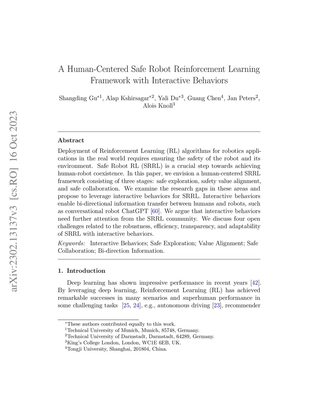 Deployment of Reinforcement Learning (RL) algorithms for robotics applications in the real world requires ensuring the safety of the robot and its environment. Safe Robot RL (SRRL) is a crucial step towards achieving human-robot coexistence. In this paper, we envision a human-centered SRRL framework consisting of three stages: safe exploration, safety value alignment, and safe collaboration. We examine the research gaps in these areas and propose to leverage interactive behaviors for SRRL. Interactive behaviors enable bi-directional information transfer between humans and robots, such as conversational robot ChatGPT. We argue that interactive behaviors need further attention from the SRRL community. We discuss four open challenges related to the robustness, efficiency, transparency, and adaptability of SRRL with interactive behaviors.