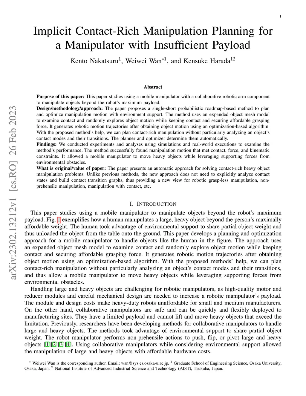 This paper uses a mobile manipulator with a collaborative robotic arm to manipulate objects beyond the robot's maximum payload. It proposes a single-shot probabilistic roadmap-based method to plan and optimize manipulation motion with environment support. The method uses an expanded object mesh model to examine contact and randomly explores object motion while keeping contact and securing affordable grasping force. It generates robotic motion trajectories after obtaining object motion using an optimization-based algorithm. With the proposed method's help, we can plan contact-rich manipulation without particularly analyzing an object's contact modes and their transitions. The planner and optimizer determine them automatically. We conducted experiments and analyses using simulations and real-world executions to examine the method's performance. It can successfully find manipulation motion that met contact, force, and kinematic constraints, thus allowing a mobile manipulator to move heavy objects while leveraging supporting forces from environmental obstacles. The mehtod does not need to explicitly analyze contact states and build contact transition graphs, thus providing a new view for robotic grasp-less manipulation, non-prehensile manipulation, manipulation with contact, etc.