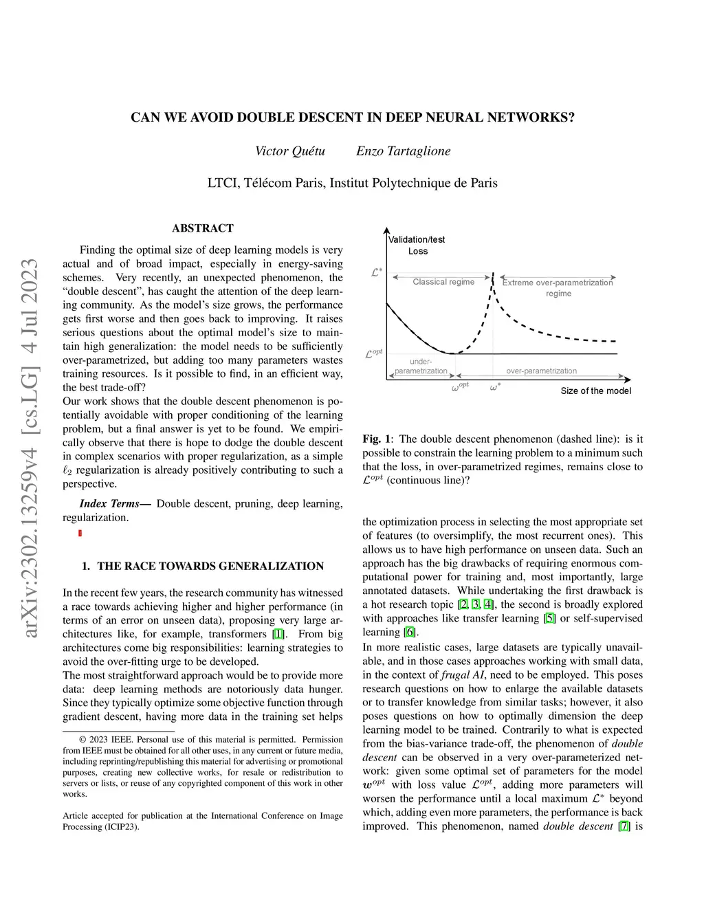 Finding the optimal size of deep learning models is very actual and of broad impact, especially in energy-saving schemes. Very recently, an unexpected phenomenon, the ``double descent'', has caught the attention of the deep learning community. As the model's size grows, the performance gets first worse, and then goes back to improving. It raises serious questions about the optimal model's size to maintain high generalization: the model needs to be sufficiently over-parametrized, but adding too many parameters wastes training resources. Is it possible to find, in an efficient way, the best trade-off? Our work shows that the double descent phenomenon is potentially avoidable with proper conditioning of the learning problem, but a final answer is yet to be found. We empirically observe that there is hope to dodge the double descent in complex scenarios with proper regularization, as a simple regularization is already positively contributing to such a perspective.
