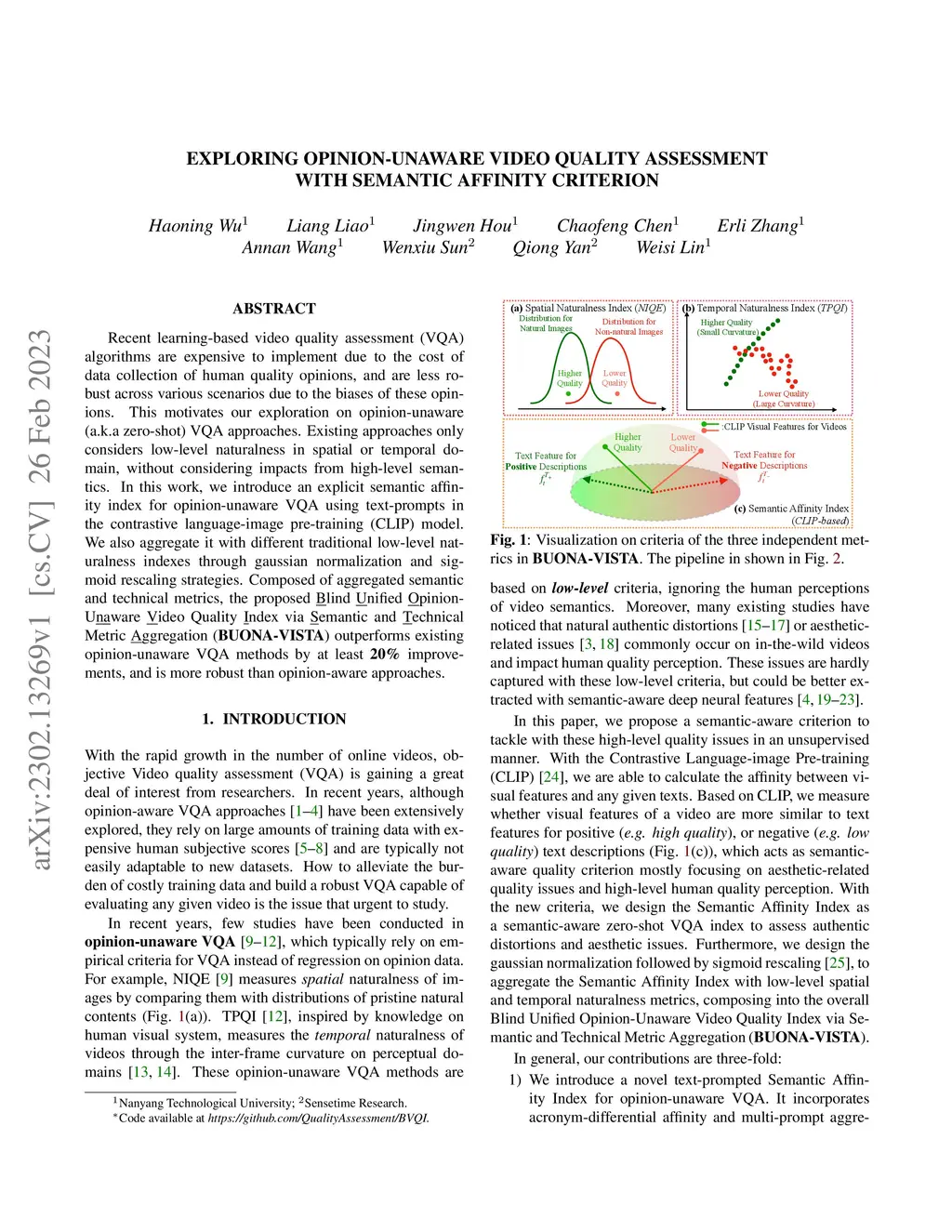 Recent learning-based video quality assessment (VQA) algorithms are expensive to implement due to the cost of data collection of human quality opinions, and are less robust across various scenarios due to the biases of these opinions. This motivates our exploration on opinion-unaware (a.k.a zero-shot) VQA approaches. Existing approaches only considers low-level naturalness in spatial or temporal domain, without considering impacts from high-level semantics. In this work, we introduce an explicit semantic affinity index for opinion-unaware VQA using text-prompts in the contrastive language-image pre-training (CLIP) model. We also aggregate it with different traditional low-level naturalness indexes through gaussian normalization and sigmoid rescaling strategies. Composed of aggregated semantic and technical metrics, the proposed Blind Unified Opinion-Unaware Video Quality Index via Semantic and Technical Metric Aggregation (BUONA-VISTA) outperforms existing opinion-unaware VQA methods by at least 20% improvements, and is more robust than opinion-aware approaches.