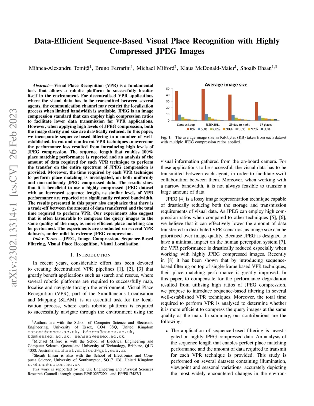 Visual Place Recognition (VPR) is a fundamental task that allows a robotic platform to successfully localise itself in the environment. For decentralised VPR applications where the visual data has to be transmitted between several agents, the communication channel may restrict the localisation process when limited bandwidth is available. JPEG is an image compression standard that can employ high compression ratios to facilitate lower data transmission for VPR applications. However, when applying high levels of JPEG compression, both the image clarity and size are drastically reduced. In this paper, we incorporate sequence-based filtering in a number of well-established, learnt and non-learnt VPR techniques to overcome the performance loss resulted from introducing high levels of JPEG compression. The sequence length that enables 100% place matching performance is reported and an analysis of the amount of data required for each VPR technique to perform the transfer on the entire spectrum of JPEG compression is provided. Moreover, the time required by each VPR technique to perform place matching is investigated, on both uniformly and non-uniformly JPEG compressed data. The results show that it is beneficial to use a highly compressed JPEG dataset with an increased sequence length, as similar levels of VPR performance are reported at a significantly reduced bandwidth. The results presented in this paper also emphasize that there is a trade-off between the amount of data transferred and the total time required to perform VPR. Our experiments also suggest that is often favourable to compress the query images to the same quality of the map, as more efficient place matching can be performed. The experiments are conducted on several VPR datasets, under mild to extreme JPEG compression.