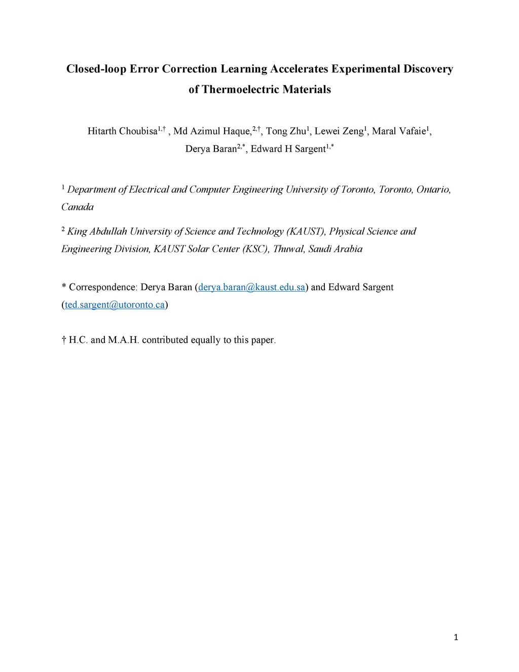 The exploration of thermoelectric materials is challenging considering the large materials space, combined with added exponential degrees of freedom coming from doping and the diversity of synthetic pathways. Here we seek to incorporate historical data and update and refine it using experimental feedback by employing error-correction learning (ECL). We thus learn from prior datasets and then adapt the model to differences in synthesis and characterization that are otherwise difficult to parameterize. We then apply this strategy to discovering thermoelectric materials where we prioritize synthesis at temperatures < 300{\deg}C. We document a previously unreported chemical family of thermoelectric materials, PbSe:SnSb, finding that the best candidate in this chemical family, 2 wt% SnSb doped PbSe, exhibits a power factor more than 2x that of PbSe. Our investigations show that our closed-loop experimentation strategy reduces the required number of experiments to find an optimized material by as much as 3x compared to high-throughput searches powered by state-of-the-art machine learning models. We also observe that this improvement is dependent on the accuracy of prior in a manner that exhibits diminishing returns, and after a certain accuracy is reached, it is factors associated with experimental pathways that dictate the trends.