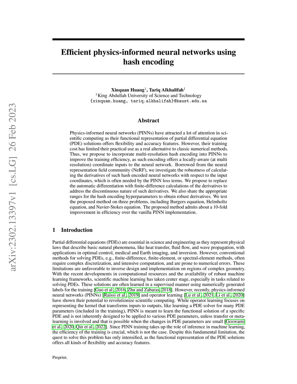 Physics-informed neural networks (PINNs) have attracted a lot of attention in scientific computing as their functional representation of partial differential equation (PDE) solutions offers flexibility and accuracy features. However, their training cost has limited their practical use as a real alternative to classic numerical methods. Thus, we propose to incorporate multi-resolution hash encoding into PINNs to improve the training efficiency, as such encoding offers a locally-aware (at multi resolution) coordinate inputs to the neural network. Borrowed from the neural representation field community (NeRF), we investigate the robustness of calculating the derivatives of such hash encoded neural networks with respect to the input coordinates, which is often needed by the PINN loss terms. We propose to replace the automatic differentiation with finite-difference calculations of the derivatives to address the discontinuous nature of such derivatives. We also share the appropriate ranges for the hash encoding hyperparameters to obtain robust derivatives. We test the proposed method on three problems, including Burgers equation, Helmholtz equation, and Navier-Stokes equation. The proposed method admits about a 10-fold improvement in efficiency over the vanilla PINN implementation.