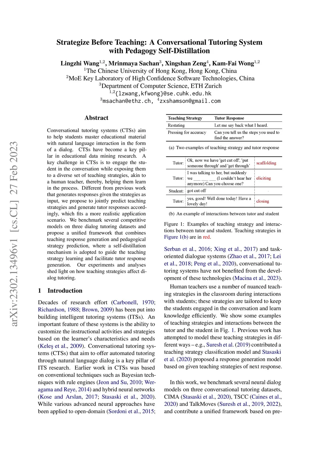 Conversational tutoring systems (CTSs) aim to help students master educational material with natural language interaction in the form of a dialog. CTSs have become a key pillar in educational data mining research. A key challenge in CTSs is to engage the student in the conversation while exposing them to a diverse set of teaching strategies, akin to a human teacher, thereby, helping them learn in the process. Different from previous work that generates responses given the strategies as input, we propose to jointly predict teaching strategies and generate tutor responses accordingly, which fits a more realistic application scenario. We benchmark several competitive models on three dialog tutoring datasets and propose a unified framework that combines teaching response generation and pedagogical strategy prediction, where a self-distillation mechanism is adopted to guide the teaching strategy learning and facilitate tutor response generation. Our experiments and analyses shed light on how teaching strategies affect dialog tutoring.