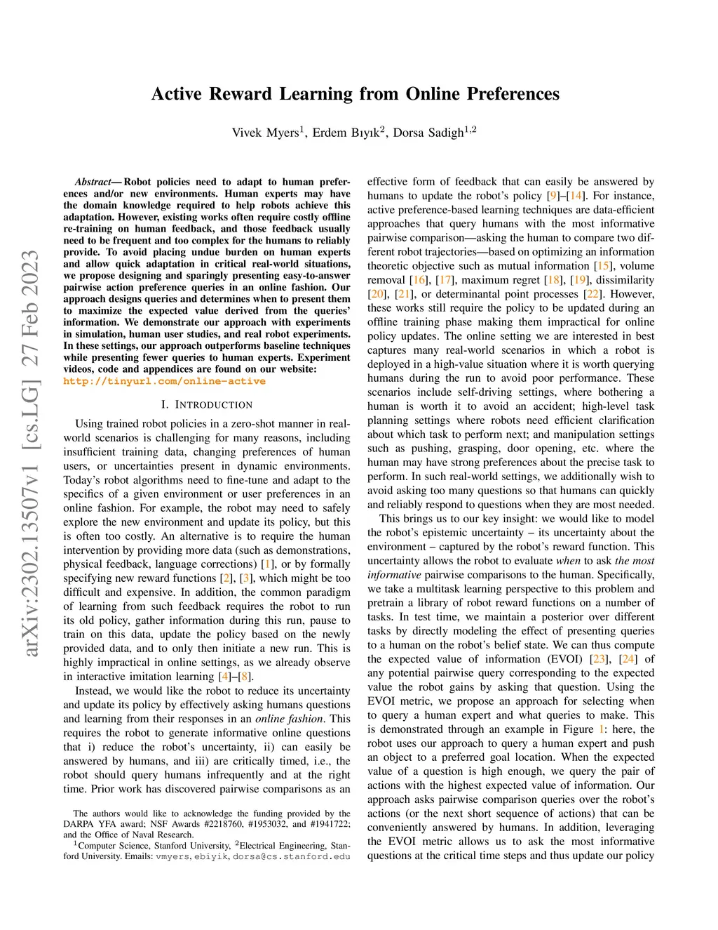 Active Reward Learning from Online Preferences
