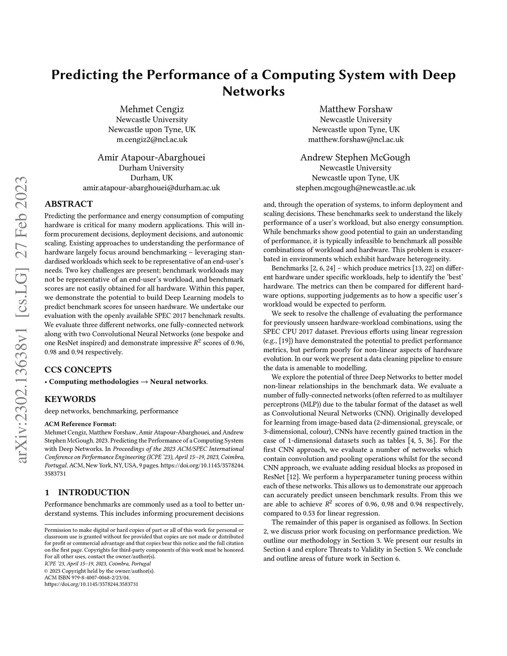 Predicting the performance and energy consumption of computing hardware is critical for many modern applications. This will inform procurement decisions, deployment decisions, and autonomic scaling. Existing approaches to understanding the performance of hardware largely focus around benchmarking -- leveraging standardised workloads which seek to be representative of an end-user's needs. Two key challenges are present; benchmark workloads may not be representative of an end-user's workload, and benchmark scores are not easily obtained for all hardware. Within this paper, we demonstrate the potential to build Deep Learning models to predict benchmark scores for unseen hardware. We undertake our evaluation with the openly available SPEC 2017 benchmark results. We evaluate three different networks, one fully-connected network along with two Convolutional Neural Networks (one bespoke and one ResNet inspired) and demonstrate impressive scores of 0.96, 0.98 and 0.94 respectively.