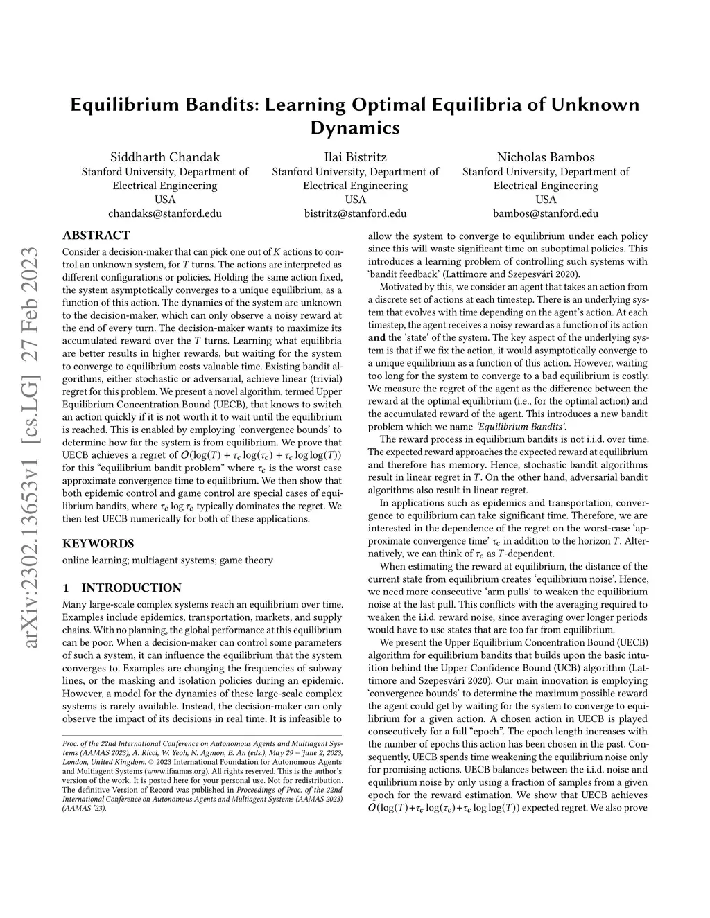 Consider a decision-maker that can pick one out of actions to control an unknown system, for turns. The actions are interpreted as different configurations or policies. Holding the same action fixed, the system asymptotically converges to a unique equilibrium, as a function of this action. The dynamics of the system are unknown to the decision-maker, which can only observe a noisy reward at the end of every turn. The decision-maker wants to maximize its accumulated reward over the turns. Learning what equilibria are better results in higher rewards, but waiting for the system to converge to equilibrium costs valuable time. Existing bandit algorithms, either stochastic or adversarial, achieve linear (trivial) regret for this problem. We present a novel algorithm, termed Upper Equilibrium Concentration Bound (UECB), that knows to switch an action quickly if it is not worth it to wait until the equilibrium is reached. This is enabled by employing convergence bounds to determine how far the system is from equilibrium. We prove that UECB achieves a regret of for this equilibrium bandit problem where is the worst case approximate convergence time to equilibrium. We then show that both epidemic control and game control are special cases of equilibrium bandits, where typically dominates the regret. We then test UECB numerically for both of these applications.