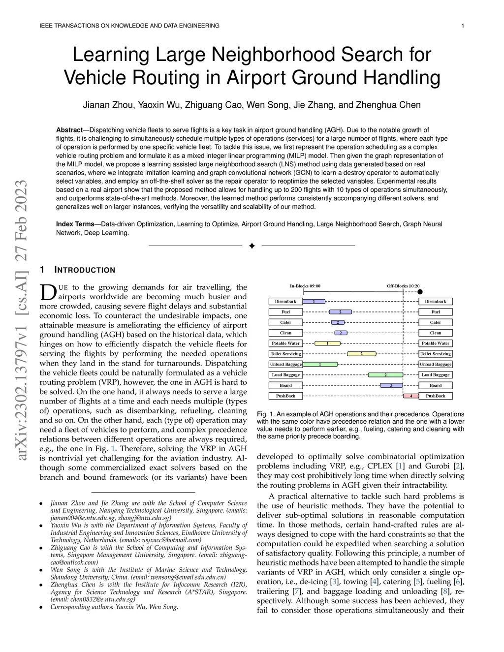 Dispatching vehicle fleets to serve flights is a key task in airport ground handling (AGH). Due to the notable growth of flights, it is challenging to simultaneously schedule multiple types of operations (services) for a large number of flights, where each type of operation is performed by one specific vehicle fleet. To tackle this issue, we first represent the operation scheduling as a complex vehicle routing problem and formulate it as a mixed integer linear programming (MILP) model. Then given the graph representation of the MILP model, we propose a learning assisted large neighborhood search (LNS) method using data generated based on real scenarios, where we integrate imitation learning and graph convolutional network (GCN) to learn a destroy operator to automatically select variables, and employ an off-the-shelf solver as the repair operator to reoptimize the selected variables. Experimental results based on a real airport show that the proposed method allows for handling up to 200 flights with 10 types of operations simultaneously, and outperforms state-of-the-art methods. Moreover, the learned method performs consistently accompanying different solvers, and generalizes well on larger instances, verifying the versatility and scalability of our method.