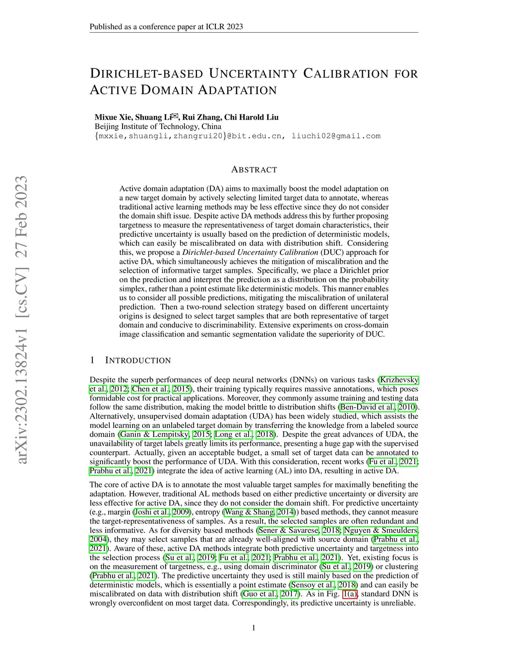 Active domain adaptation (DA) aims to maximally boost the model adaptation on a new target domain by actively selecting limited target data to annotate, whereas traditional active learning methods may be less effective since they do not consider the domain shift issue. Despite active DA methods address this by further proposing targetness to measure the representativeness of target domain characteristics, their predictive uncertainty is usually based on the prediction of deterministic models, which can easily be miscalibrated on data with distribution shift. Considering this, we propose a \textit{Dirichlet-based Uncertainty Calibration} (DUC) approach for active DA, which simultaneously achieves the mitigation of miscalibration and the selection of informative target samples. Specifically, we place a Dirichlet prior on the prediction and interpret the prediction as a distribution on the probability simplex, rather than a point estimate like deterministic models. This manner enables us to consider all possible predictions, mitigating the miscalibration of unilateral prediction. Then a two-round selection strategy based on different uncertainty origins is designed to select target samples that are both representative of target domain and conducive to discriminability. Extensive experiments on cross-domain image classification and semantic segmentation validate the superiority of DUC.