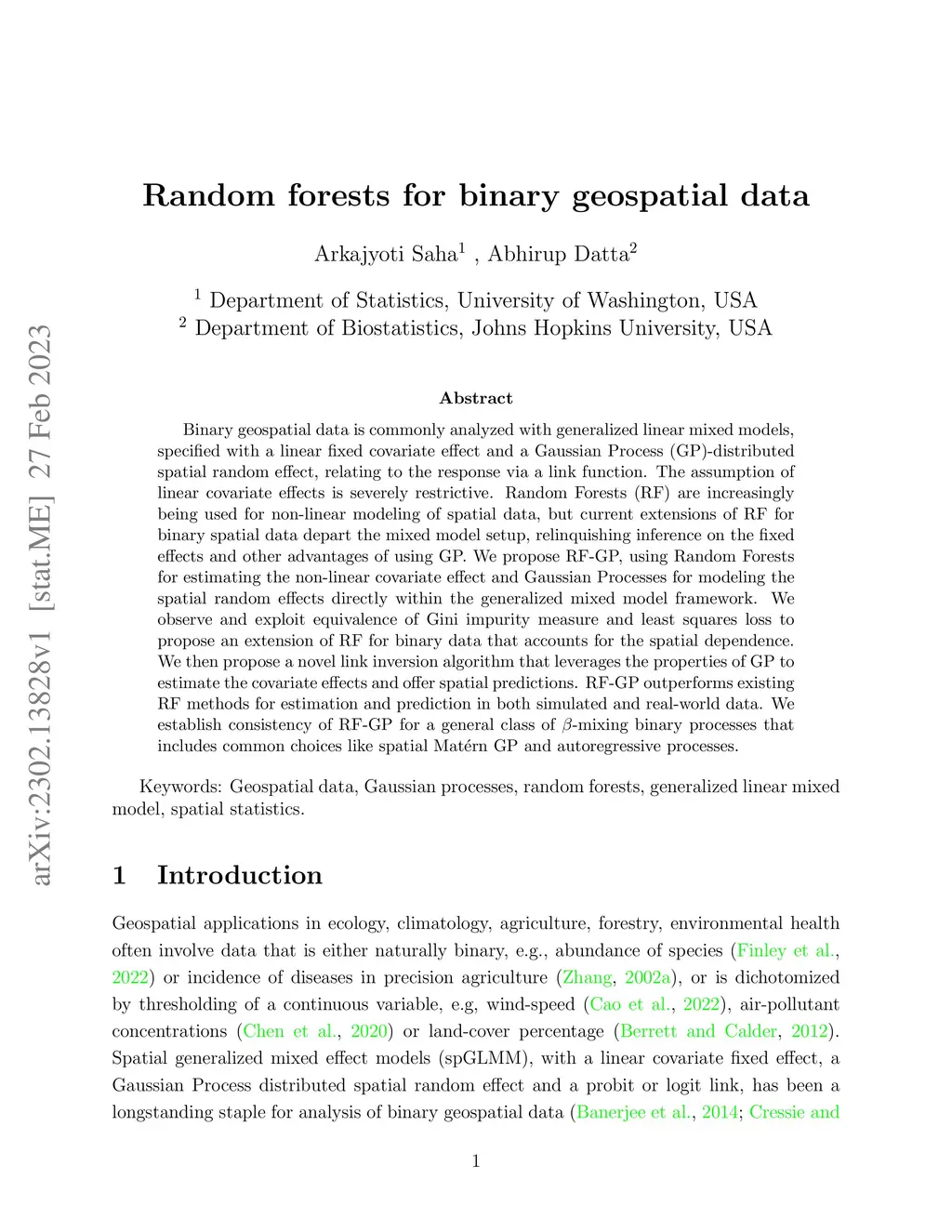 The manuscript develops new method and theory for non-linear regression for binary dependent data using random forests. Existing implementations of random forests for binary data cannot explicitly account for data correlation common in geospatial and time-series settings. For continuous outcomes, recent work has extended random forests (RF) to RF-GLS that incorporate spatial covariance using the generalized least squares (GLS) loss. However, adoption of this idea for binary data is challenging due to the use of the Gini impurity measure in classification trees, which has no known extension to model dependence. We show that for binary data, the GLS loss is also an extension of the Gini impurity measure, as the latter is exactly equivalent to the ordinary least squares (OLS) loss. This justifies using RF-GLS for non-parametric mean function estimation for binary dependent data. We then consider the special case of generalized mixed effects models, the traditional statistical model for binary geospatial data, which models the spatial random effects as a Gaussian process (GP). We propose a novel link-inversion technique that embeds the RF-GLS estimate of the mean function from the first step within the generalized mixed effects model framework, enabling estimation of non-linear covariate effects and offering spatial predictions. We establish consistency of our method, RF-GP, for both mean function and covariate effect estimation. The theory holds for a general class of stationary absolutely regular dependent processes that includes common choices like Gaussian processes with Matérn or compactly supported covariances and autoregressive processes. The theory relaxes the common assumption of additive mean functions and accounts for the non-linear link. We demonstrate that RF-GP outperforms competing methods for estimation and prediction in both simulated and real-world data.