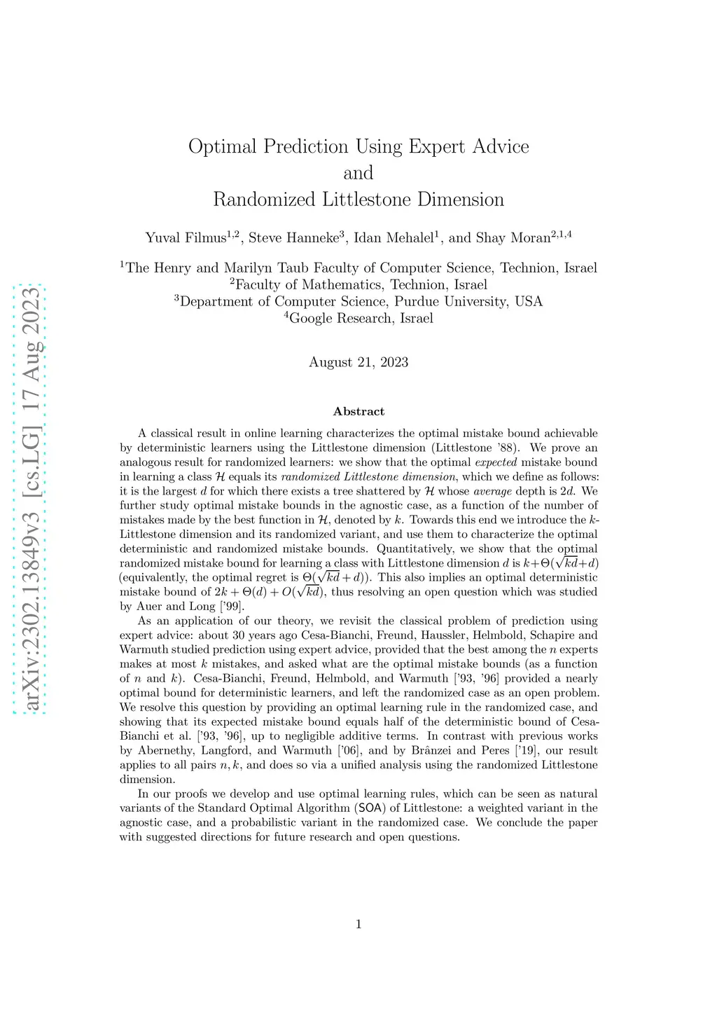 A classical result in online learning characterizes the optimal mistake bound achievable by deterministic learners using the Littlestone dimension (Littlestone '88). We prove an analogous result for randomized learners: we show that the optimal expected mistake bound in learning a class equals its randomized Littlestone dimension, which is the largest for which there exists a tree shattered by whose average depth is . We further study optimal mistake bounds in the agnostic case, as a function of the number of mistakes made by the best function in , denoted by . We show that the optimal randomized mistake bound for learning a class with Littlestone dimension is . This also implies an optimal deterministic mistake bound of , thus resolving an open question which was studied by Auer and Long ['99].As an application of our theory, we revisit the classical problem of prediction using expert advice: about 30 years ago Cesa-Bianchi, Freund, Haussler, Helmbold, Schapire and Warmuth studied prediction using expert advice, provided that the best among the experts makes at most mistakes, and asked what are the optimal mistake bounds. Cesa-Bianchi, Freund, Helmbold, and Warmuth ['93, '96] provided a nearly optimal bound for deterministic learners, and left the randomized case as an open problem. We resolve this question by providing an optimal learning rule in the randomized case, and showing that its expected mistake bound equals half of the deterministic bound of Cesa-Bianchi et al. ['93,'96], up to negligible additive terms. In contrast with previous works by Abernethy, Langford, and Warmuth ['06], and by Brânzei and Peres ['19], our result applies to all pairs .
