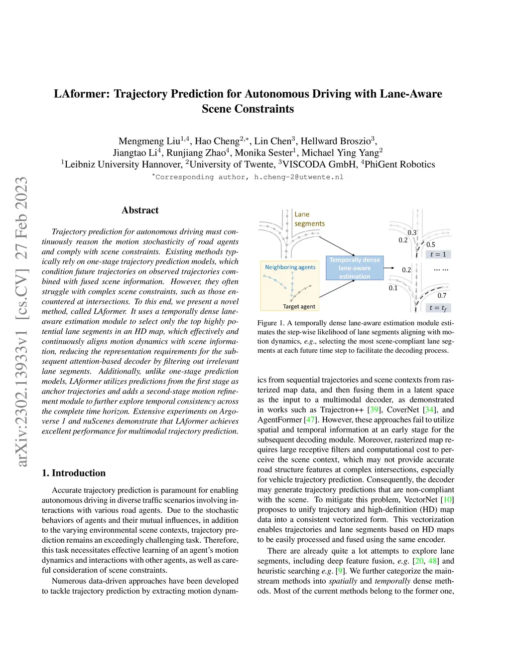 Trajectory prediction for autonomous driving must continuously reason the motion stochasticity of road agents and comply with scene constraints. Existing methods typically rely on one-stage trajectory prediction models, which condition future trajectories on observed trajectories combined with fused scene information. However, they often struggle with complex scene constraints, such as those encountered at intersections. To this end, we present a novel method, called LAformer. It uses a temporally dense lane-aware estimation module to select only the top highly potential lane segments in an HD map, which effectively and continuously aligns motion dynamics with scene information, reducing the representation requirements for the subsequent attention-based decoder by filtering out irrelevant lane segments. Additionally, unlike one-stage prediction models, LAformer utilizes predictions from the first stage as anchor trajectories and adds a second-stage motion refinement module to further explore temporal consistency across the complete time horizon. Extensive experiments on Argoverse 1 and nuScenes demonstrate that LAformer achieves excellent performance for multimodal trajectory prediction.
