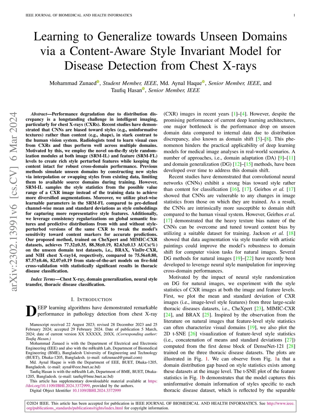Performance degradation due to distribution discrepancy is a longstanding challenge in intelligent imaging, particularly for chest X-rays (CXRs). Recent studies have demonstrated that CNNs are biased toward styles (e.g., uninformative textures) rather than content (e.g., shape), in stark contrast to the human vision system. Radiologists tend to learn visual cues from CXRs and thus perform well across multiple domains. Motivated by this, we employ the novel on-the-fly style randomization modules at both image (SRM-IL) and feature (SRM-FL) levels to create rich style perturbed features while keeping the content intact for robust cross-domain performance. Previous methods simulate unseen domains by constructing new styles via interpolation or swapping styles from existing data, limiting them to available source domains during training. However, SRM-IL samples the style statistics from the possible value range of a CXR image instead of the training data to achieve more diversified augmentations. Moreover, we utilize pixel-wise learnable parameters in the SRM-FL compared to pre-defined channel-wise mean and standard deviations as style embeddings for capturing more representative style features. Additionally, we leverage consistency regularizations on global semantic features and predictive distributions from with and without style-perturbed versions of the same CXR to tweak the model's sensitivity toward content markers for accurate predictions. Our proposed method, trained on CheXpert and MIMIC-CXR datasets, achieves 77.320.35, 88.380.19, 82.630.13 AUCs(%) on the unseen domain test datasets, i.e., BRAX, VinDr-CXR, and NIH chest X-ray14, respectively, compared to 75.560.80, 87.570.46, 82.070.19 from state-of-the-art models on five-fold cross-validation with statistically significant results in thoracic disease classification.