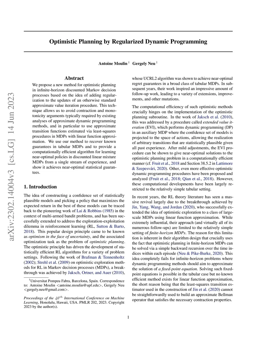 We propose a new method for optimistic planning in infinite-horizon discounted Markov decision processes based on the idea of adding regularization to the updates of an otherwise standard approximate value iteration procedure. This technique allows us to avoid contraction and monotonicity arguments typically required by existing analyses of approximate dynamic programming methods, and in particular to use approximate transition functions estimated via least-squares procedures in MDPs with linear function approximation. We use our method to recover known guarantees in tabular MDPs and to provide a computationally efficient algorithm for learning near-optimal policies in discounted linear mixture MDPs from a single stream of experience, and show it achieves near-optimal statistical guarantees.