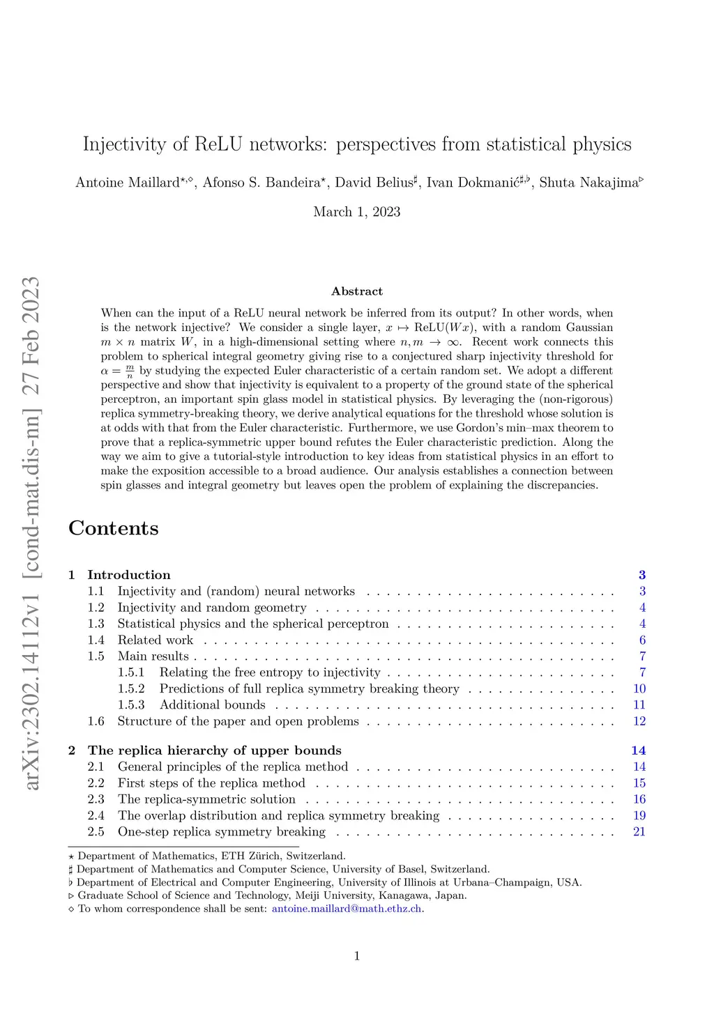 When can the input of a ReLU neural network be inferred from its output? In other words, when is the network injective? We consider a single layer, , with a random Gaussian matrix , in a high-dimensional setting where . Recent work connects this problem to spherical integral geometry giving rise to a conjectured sharp injectivity threshold for by studying the expected Euler characteristic of a certain random set. We adopt a different perspective and show that injectivity is equivalent to a property of the ground state of the spherical perceptron, an important spin glass model in statistical physics. By leveraging the (non-rigorous) replica symmetry-breaking theory, we derive analytical equations for the threshold whose solution is at odds with that from the Euler characteristic. Furthermore, we use Gordon's min--max theorem to prove that a replica-symmetric upper bound refutes the Euler characteristic prediction. Along the way we aim to give a tutorial-style introduction to key ideas from statistical physics in an effort to make the exposition accessible to a broad audience. Our analysis establishes a connection between spin glasses and integral geometry but leaves open the problem of explaining the discrepancies.