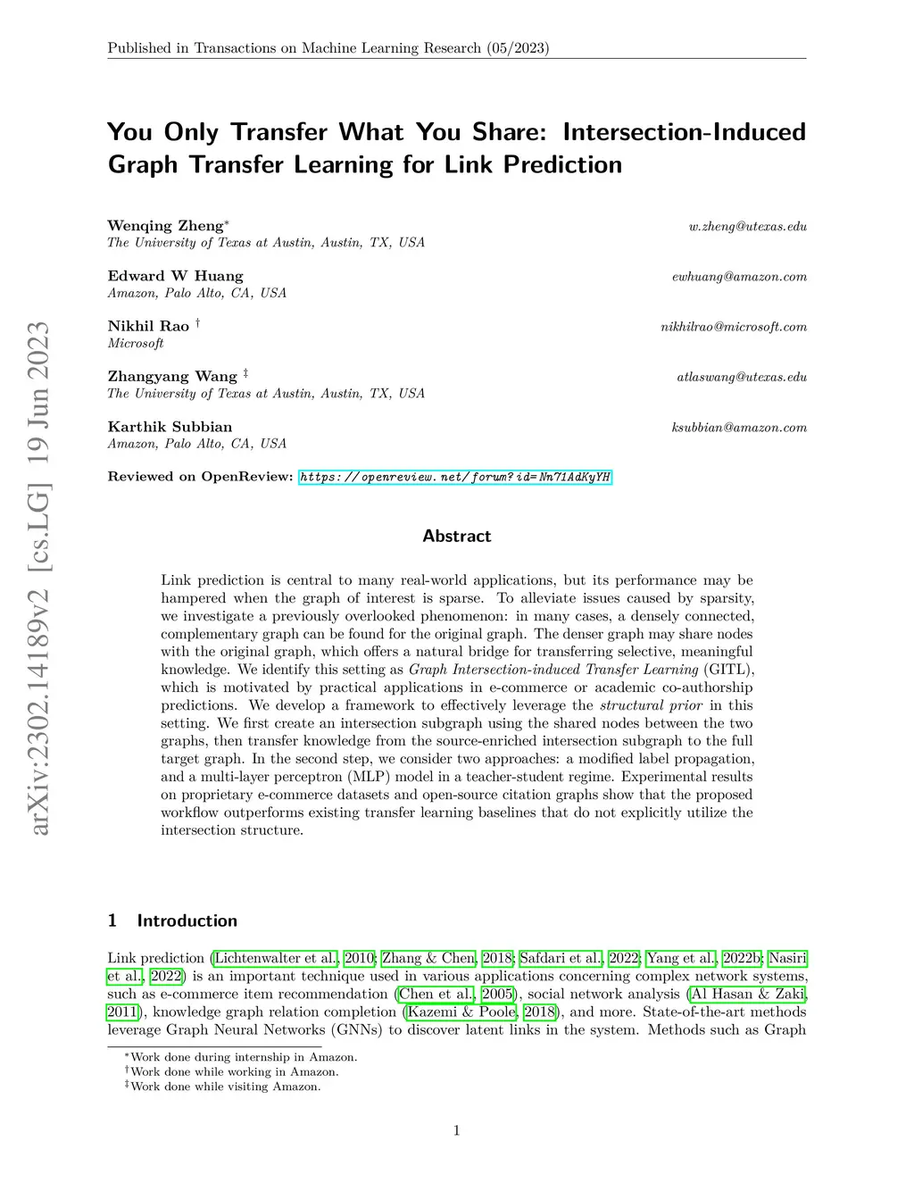 Link prediction is central to many real-world applications, but its performance may be hampered when the graph of interest is sparse. To alleviate issues caused by sparsity, we investigate a previously overlooked phenomenon: in many cases, a densely connected, complementary graph can be found for the original graph. The denser graph may share nodes with the original graph, which offers a natural bridge for transferring selective, meaningful knowledge. We identify this setting as Graph Intersection-induced Transfer Learning (GITL), which is motivated by practical applications in e-commerce or academic co-authorship predictions. We develop a framework to effectively leverage the structural prior in this setting. We first create an intersection subgraph using the shared nodes between the two graphs, then transfer knowledge from the source-enriched intersection subgraph to the full target graph. In the second step, we consider two approaches: a modified label propagation, and a multi-layer perceptron (MLP) model in a teacher-student regime. Experimental results on proprietary e-commerce datasets and open-source citation graphs show that the proposed workflow outperforms existing transfer learning baselines that do not explicitly utilize the intersection structure.