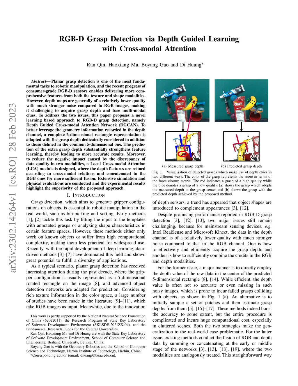 Planar grasp detection is one of the most fundamental tasks to robotic manipulation, and the recent progress of consumer-grade RGB-D sensors enables delivering more comprehensive features from both the texture and shape modalities. However, depth maps are generally of a relatively lower quality with much stronger noise compared to RGB images, making it challenging to acquire grasp depth and fuse multi-modal clues. To address the two issues, this paper proposes a novel learning based approach to RGB-D grasp detection, namely Depth Guided Cross-modal Attention Network (DGCAN). To better leverage the geometry information recorded in the depth channel, a complete 6-dimensional rectangle representation is adopted with the grasp depth dedicatedly considered in addition to those defined in the common 5-dimensional one. The prediction of the extra grasp depth substantially strengthens feature learning, thereby leading to more accurate results. Moreover, to reduce the negative impact caused by the discrepancy of data quality in two modalities, a Local Cross-modal Attention (LCA) module is designed, where the depth features are refined according to cross-modal relations and concatenated to the RGB ones for more sufficient fusion. Extensive simulation and physical evaluations are conducted and the experimental results highlight the superiority of the proposed approach.