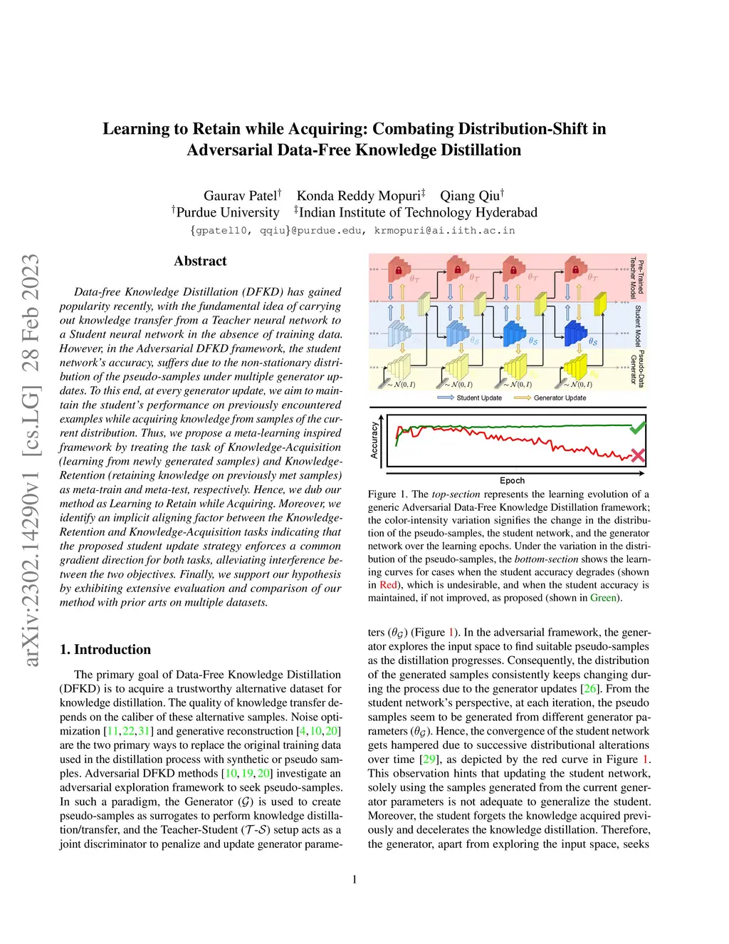 Data-free Knowledge Distillation (DFKD) has gained popularity recently, with the fundamental idea of carrying out knowledge transfer from a Teacher neural network to a Student neural network in the absence of training data. However, in the Adversarial DFKD framework, the student network's accuracy, suffers due to the non-stationary distribution of the pseudo-samples under multiple generator updates. To this end, at every generator update, we aim to maintain the student's performance on previously encountered examples while acquiring knowledge from samples of the current distribution. Thus, we propose a meta-learning inspired framework by treating the task of Knowledge-Acquisition (learning from newly generated samples) and Knowledge-Retention (retaining knowledge on previously met samples) as meta-train and meta-test, respectively. Hence, we dub our method as Learning to Retain while Acquiring. Moreover, we identify an implicit aligning factor between the Knowledge-Retention and Knowledge-Acquisition tasks indicating that the proposed student update strategy enforces a common gradient direction for both tasks, alleviating interference between the two objectives. Finally, we support our hypothesis by exhibiting extensive evaluation and comparison of our method with prior arts on multiple datasets.