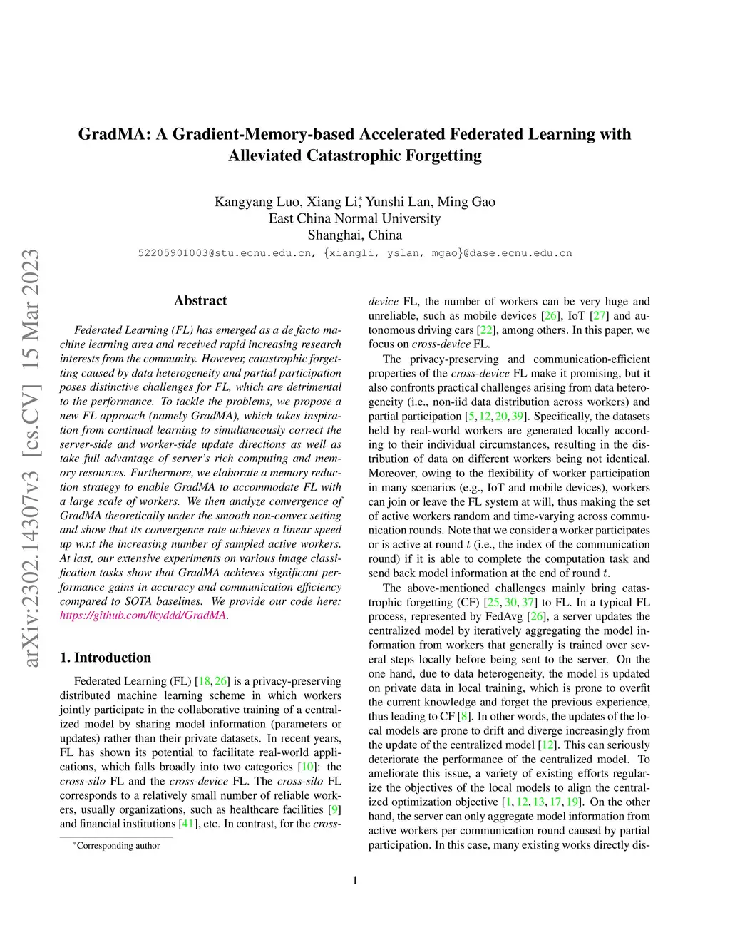 Federated Learning (FL) has emerged as a de facto machine learning area and received rapid increasing research interests from the community. However, catastrophic forgetting caused by data heterogeneity and partial participation poses distinctive challenges for FL, which are detrimental to the performance. To tackle the problems, we propose a new FL approach (namely GradMA), which takes inspiration from continual learning to simultaneously correct the server-side and worker-side update directions as well as take full advantage of server's rich computing and memory resources. Furthermore, we elaborate a memory reduction strategy to enable GradMA to accommodate FL with a large scale of workers. We then analyze convergence of GradMA theoretically under the smooth non-convex setting and show that its convergence rate achieves a linear speed up w.r.t the increasing number of sampled active workers. At last, our extensive experiments on various image classification tasks show that GradMA achieves significant performance gains in accuracy and communication efficiency compared to SOTA baselines.