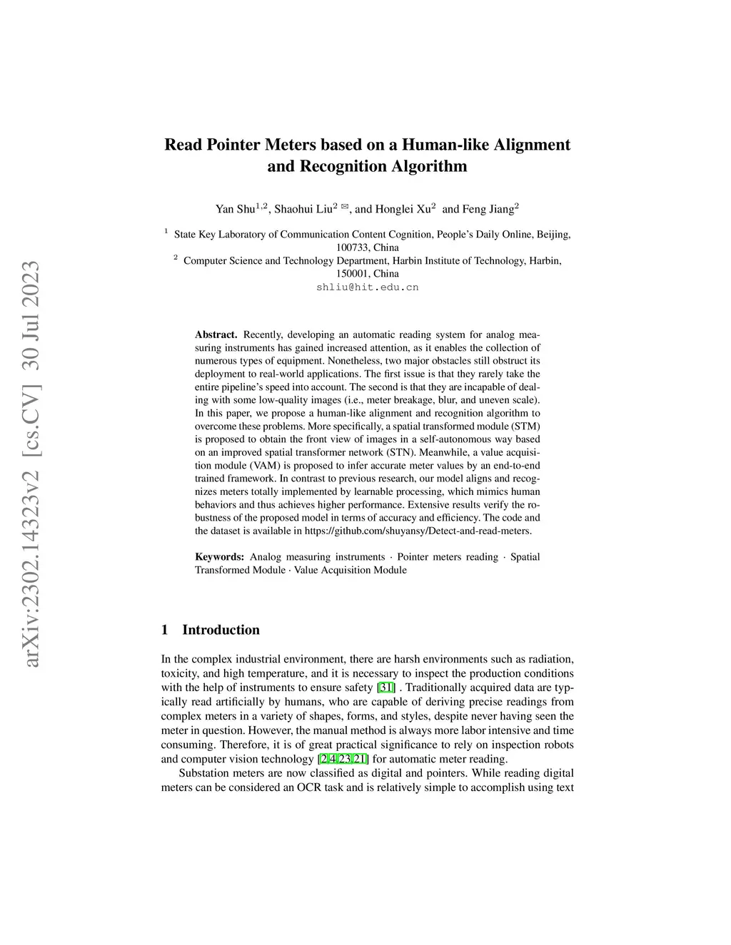 Recently, developing an automatic reading system for analog measuring instruments has gained increased attention, as it enables the collection of numerous state of equipment. Nonetheless, two major obstacles still obstruct its deployment to real-world applications. The first issue is that they rarely take the entire pipeline's speed into account. The second is that they are incapable of dealing with some low-quality images (i.e., meter breakage, blur, and uneven scale). In this paper, we propose a human-like alignment and recognition algorithm to overcome these problems. More specifically, a Spatial Transformed Module(STM) is proposed to obtain the front view of images in a self-autonomous way based on an improved Spatial Transformer Networks(STN). Meanwhile, a Value Acquisition Module(VAM) is proposed to infer accurate meter values by an end-to-end trained framework. In contrast to previous research, our model aligns and recognizes meters totally implemented by learnable processing, which mimics human's behaviours and thus achieves higher performances. Extensive results verify the good robustness of the proposed model in terms of the accuracy and efficiency.