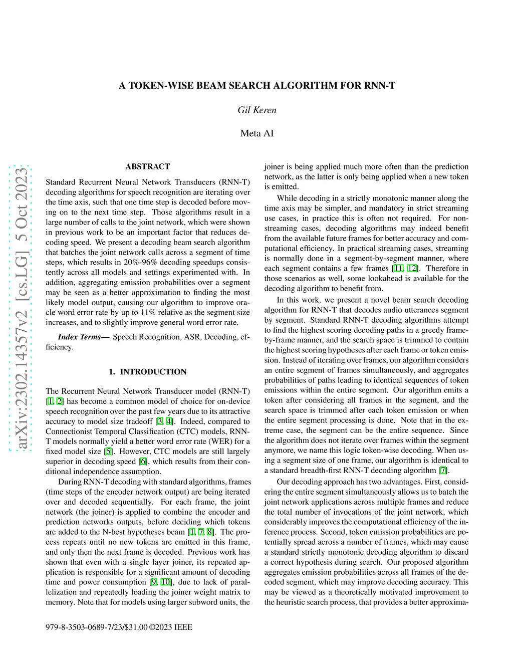 A Token-Wise Beam Search Algorithm for RNN-T