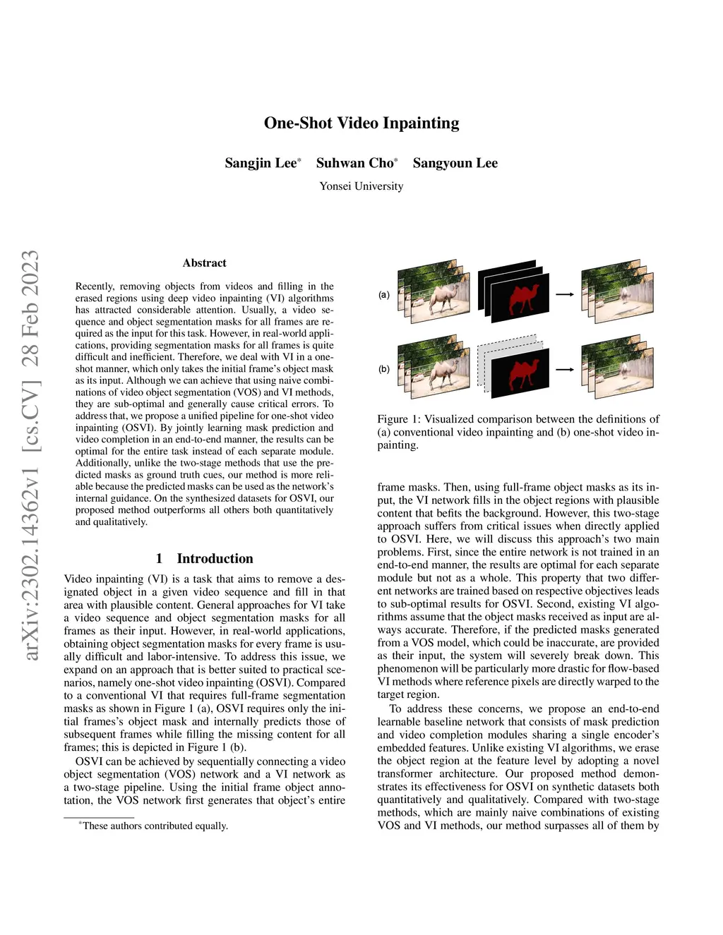 Recently, removing objects from videos and filling in the erased regions using deep video inpainting (VI) algorithms has attracted considerable attention. Usually, a video sequence and object segmentation masks for all frames are required as the input for this task. However, in real-world applications, providing segmentation masks for all frames is quite difficult and inefficient. Therefore, we deal with VI in a one-shot manner, which only takes the initial frame's object mask as its input. Although we can achieve that using naive combinations of video object segmentation (VOS) and VI methods, they are sub-optimal and generally cause critical errors. To address that, we propose a unified pipeline for one-shot video inpainting (OSVI). By jointly learning mask prediction and video completion in an end-to-end manner, the results can be optimal for the entire task instead of each separate module. Additionally, unlike the two stage methods that use the predicted masks as ground truth cues, our method is more reliable because the predicted masks can be used as the network's internal guidance. On the synthesized datasets for OSVI, our proposed method outperforms all others both quantitatively and qualitatively.